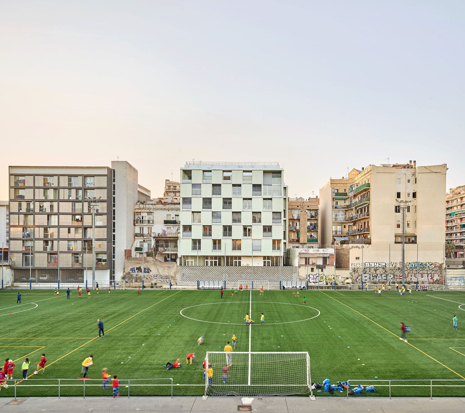 Text description provided by the architects. The project is located in a singular block of the Eixample district, formerly fragmented by the railway and currently opened to new public spaces. Two separate volumes define a large green central courtyard and circulation areas. The building facing the street consolidates the front of the block and the second one is conceived as an isolated building, even separating itself from the limits of the plot to respond to the existing irregular urban voids.