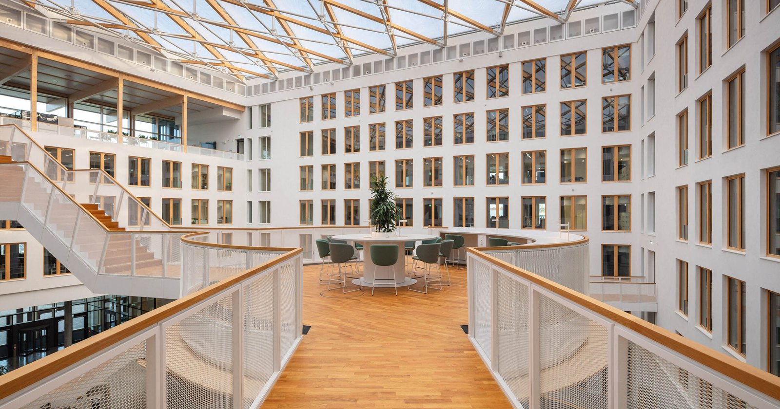 This atrium is playfully furnished with a web of tree like wooden structures that offer a variety of platforms for recreation and communication, connected by a network of by filigree steps that facilitate circulation across the building’s different parts. The sustainable state of the art design of both the buildings, which won the project the DGNB Platinum and DGNB Diamond awards, produces a healthy and vibrant work environment for employees and ensures the longevity of the buildings and the reusability of its materials.