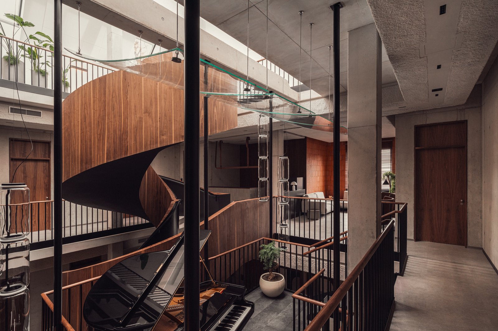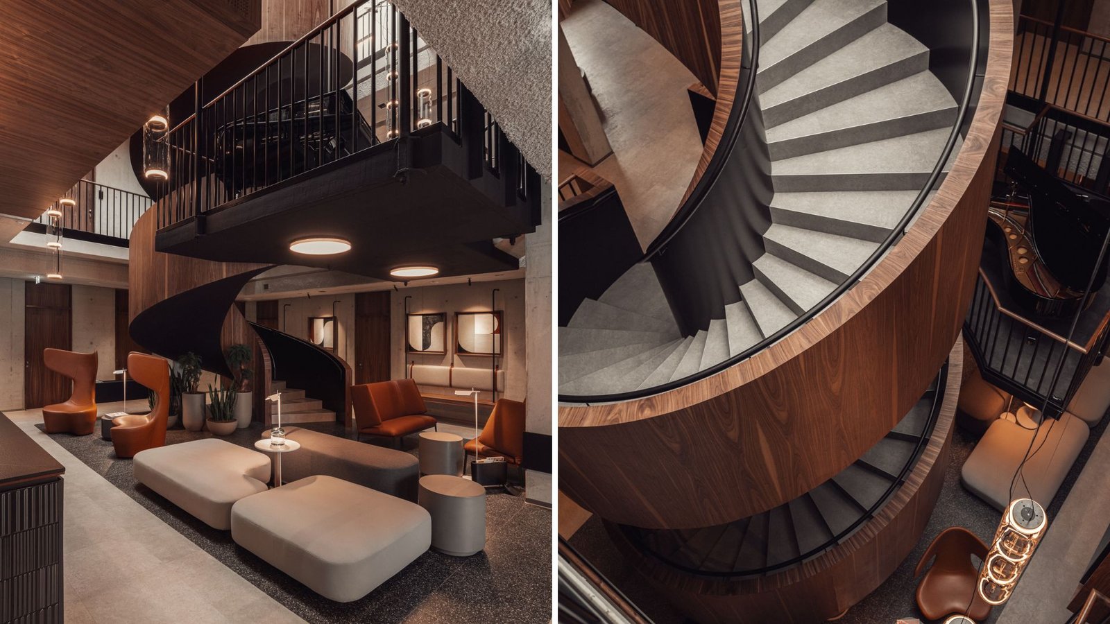 This dental clinic, once a granary, is organized around a wide spiral staircase that rises through its three-story foyer. Clad in warm wood, the stair connects waiting areas, dental offices and training spaces while giving the interior a clear center. It’s surrounded by concrete, brick and steel surfaces that reflect the building’s industrial past. Live piano music and soft lighting help create a calm atmosphere, while sound-absorbing materials keep the space quiet and focused. Envisioned as more than a circulation route, the stair shapes how people move, wait and gather inside.