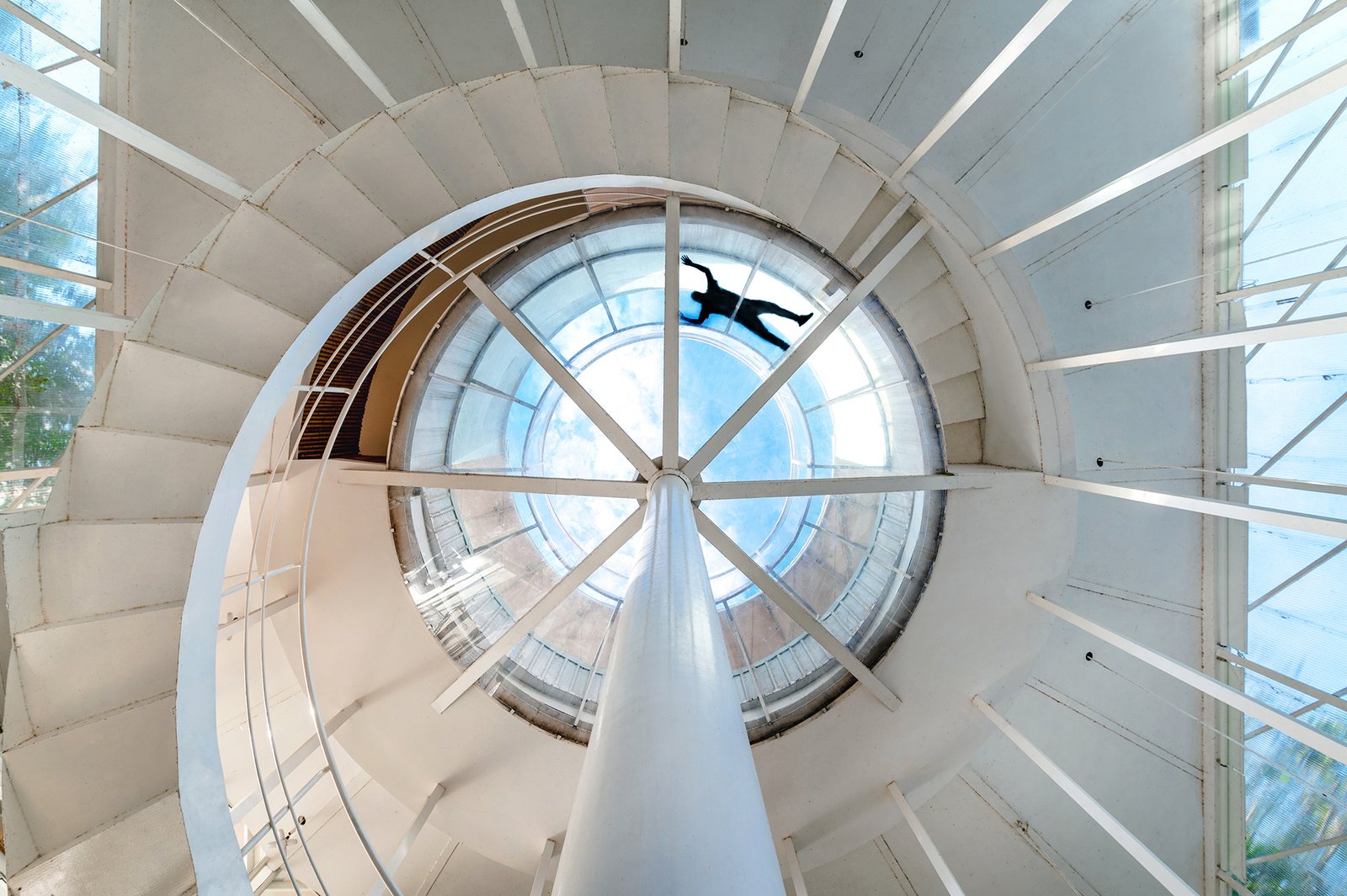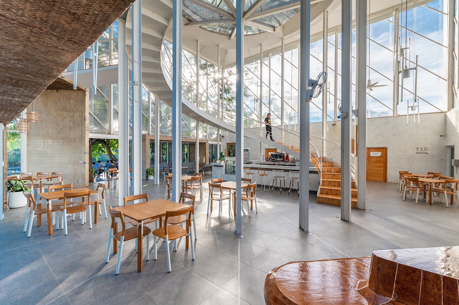 Inside this forest-side restaurant in Northeast Thailand, a white spiral staircase rises slowly through the center of a light-filled dining area. Designed for pause and perspective, the stair leads visitors to a rooftop platform that opens up to the surrounding trees. Built with slender steel members and a delicate footprint, it reflects the lightness of the overall structure and mirrors the verticality of nearby tree trunks. The stair wraps around a central cylindrical column that also serves as a rainwater drain and light shaft, drawing daylight into the heart of the space.