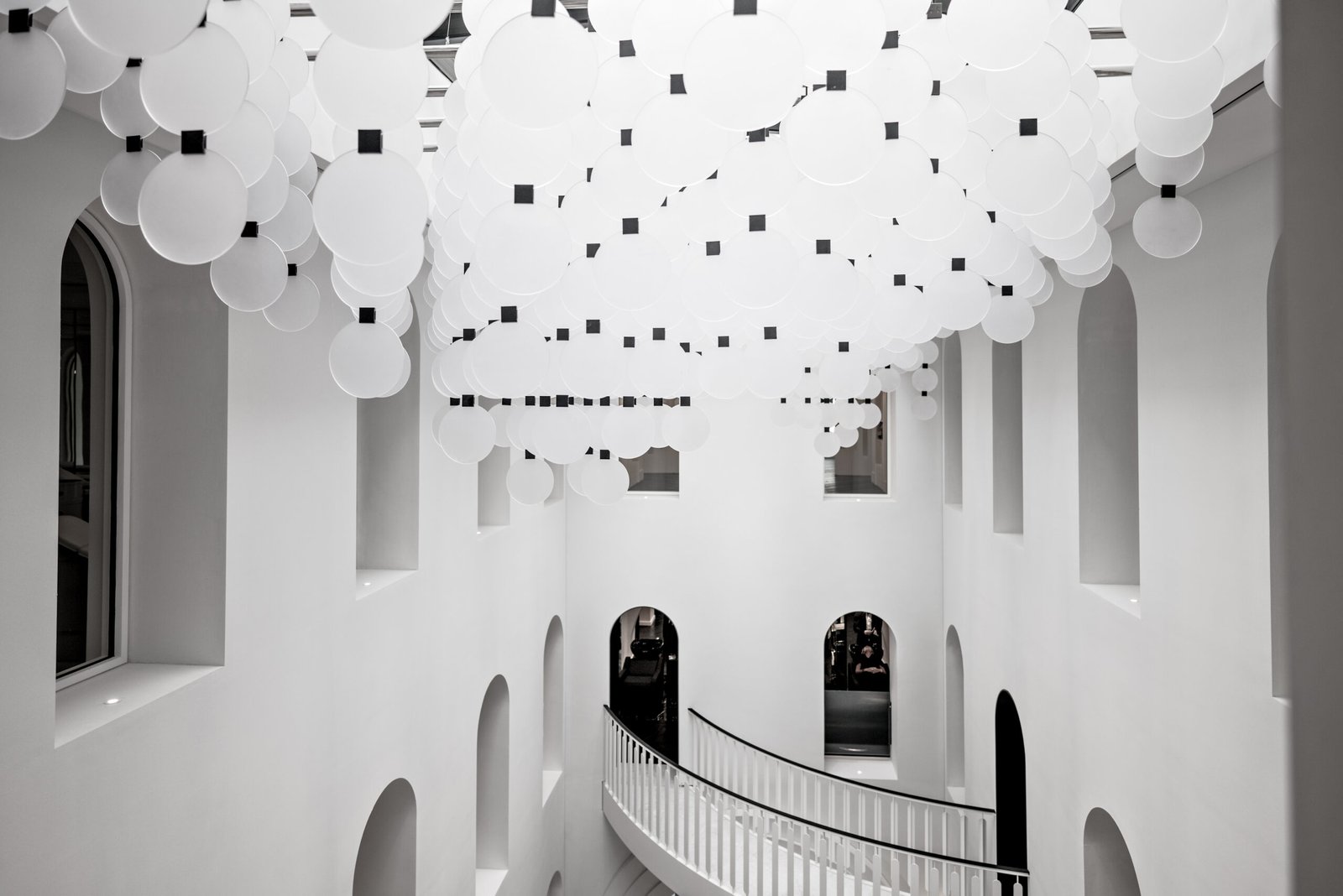 At the center of Carita’s Paris beauty house, part of the L’Oréal portfolio, a curved staircase rises through what was once a closed courtyard. The space is now topped with a tall glass roof that brings in soft, natural light. Pale marble, pink onyx and brushed metal set a quiet, polished tone. The staircase is kept light with floating steps and slim supports. It connects the levels clearly and efficiently, without blocking views through arched openings. In a building designed around care and detail, the stair adds just the right touch of structure and calm movement.