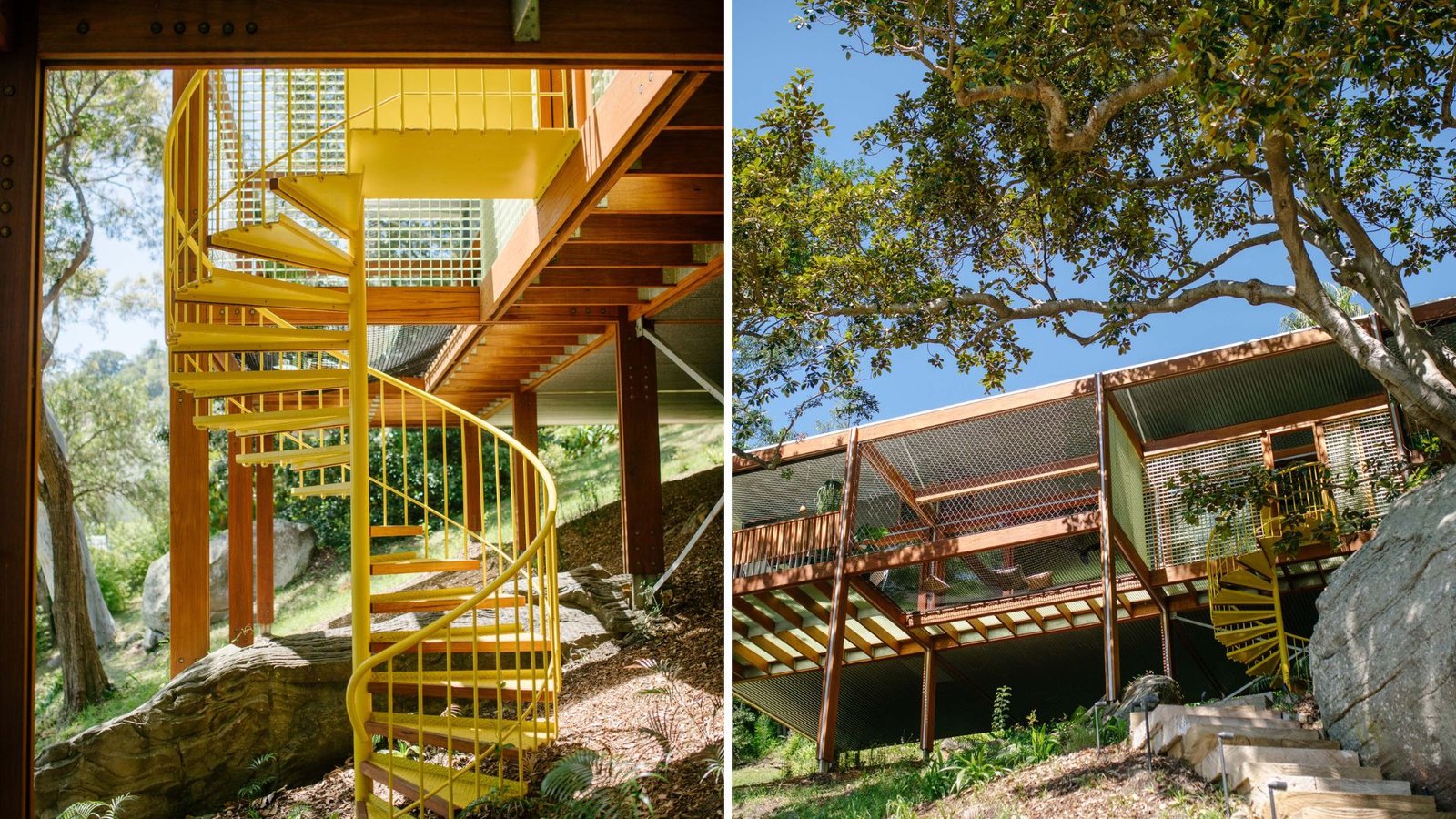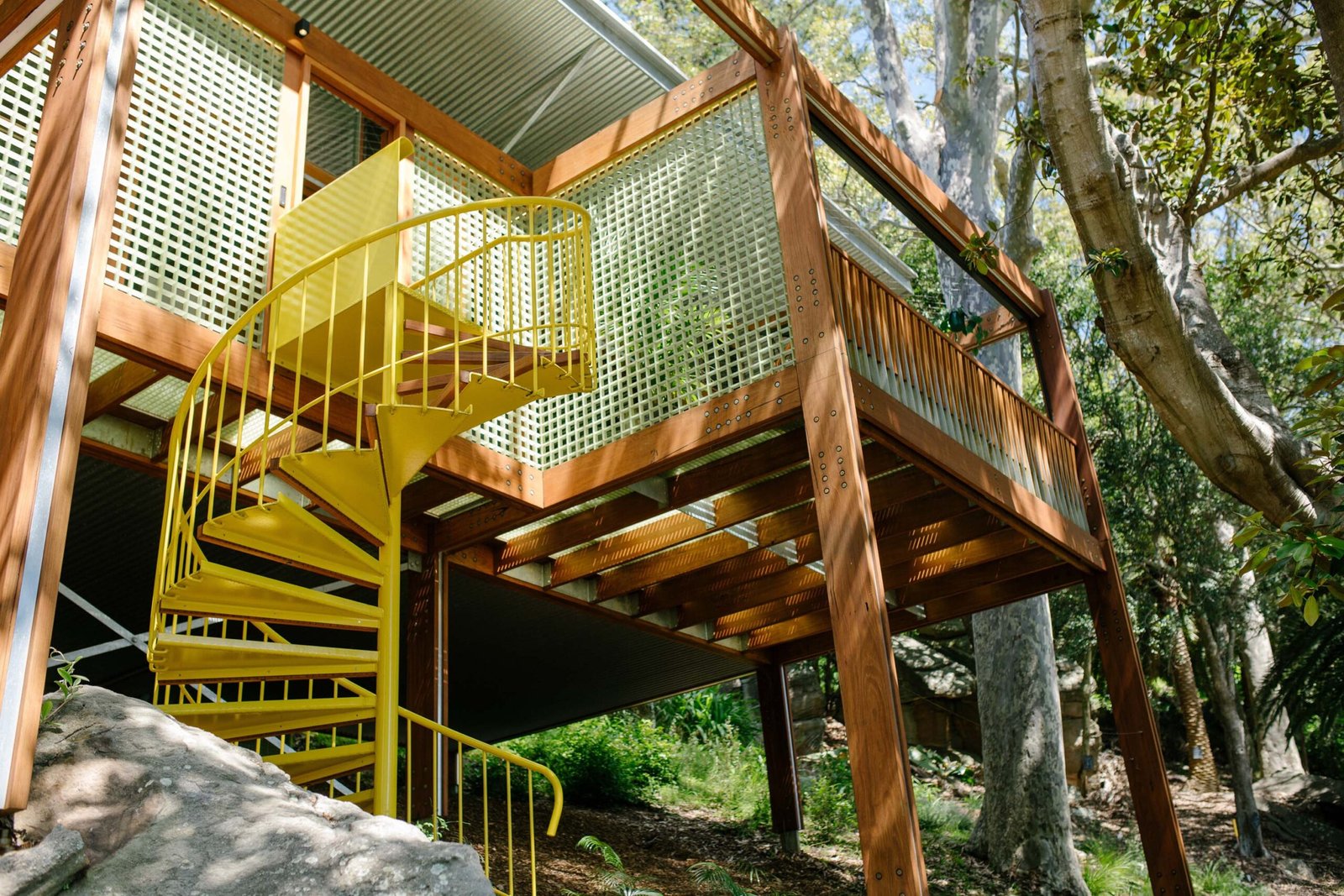 In this compact holiday home raised above a rocky slope, a yellow spiral staircase links the natural ground to the open-air platform above. Built from powder-coated steel, it curves tightly between tree trunks and timber posts, bringing a sharp contrast to the greens and browns of the site.