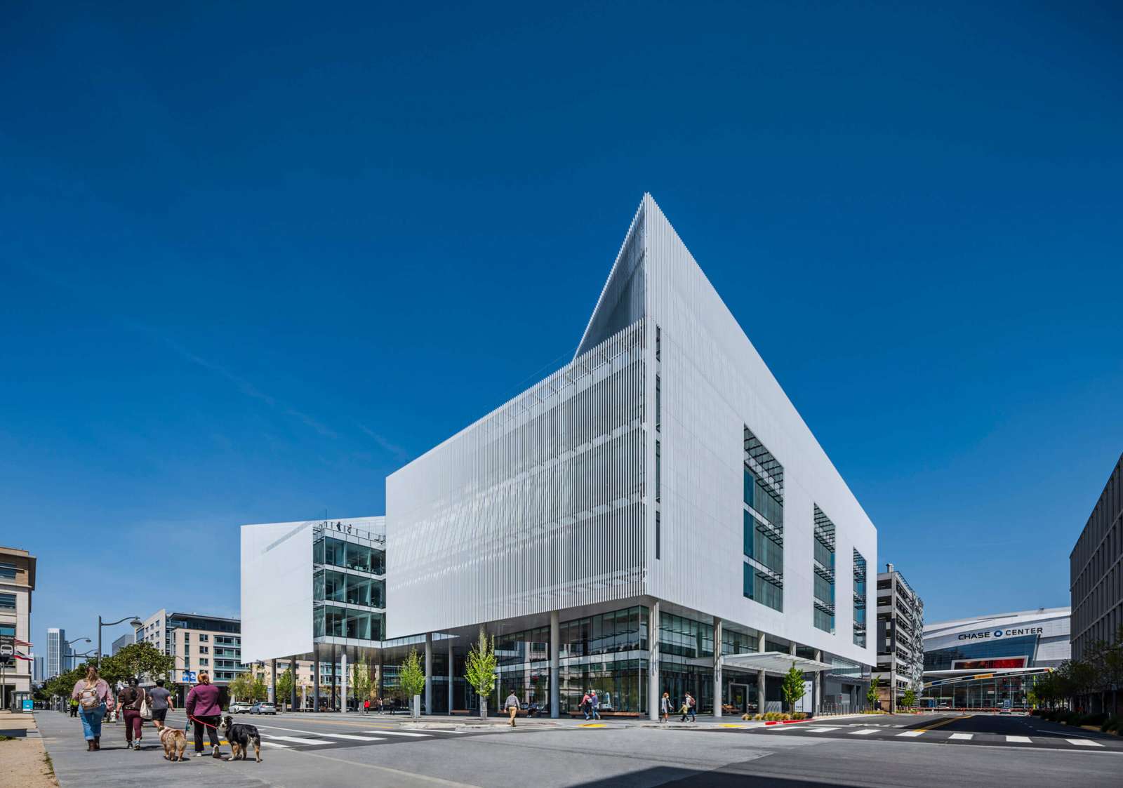 To shield those higher floors, the design team, which included the local office of SmithGroup and facade consulting firm Walters & Wolf, among others, devised a prophylactic metal screen that preserved the desired transparency. Orderly white aluminum blades suspended from the glass facades deter heat gain while adding visual interest: Depending on one’s approach, an elevation may seem opaque or clear, prompting the observer to “start reading form and abstraction in a new way,” Cavagnero said.