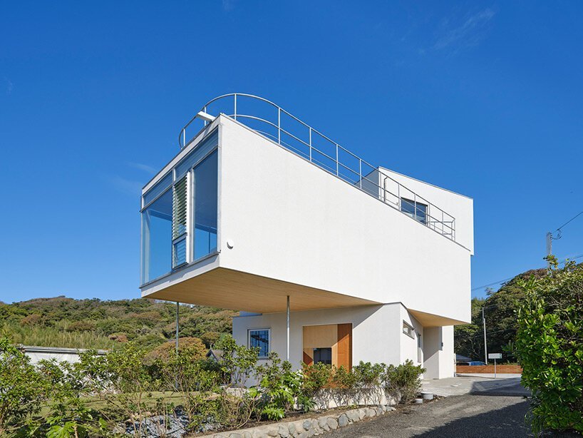 on the hillside of a small mountain in akiya, japan, architecture firm shogo onodera built a private residence that connects closely with its natural surroundings. the design is conceived to respect the existing topography and local vegetation, generating a contemporary structure that blurs the boundary between inside and outside, while offering impressive views towards the seaside. the home takes shape as a pile of box volumes that intersect and overlap, creating gaps and openings that draw natural light in.