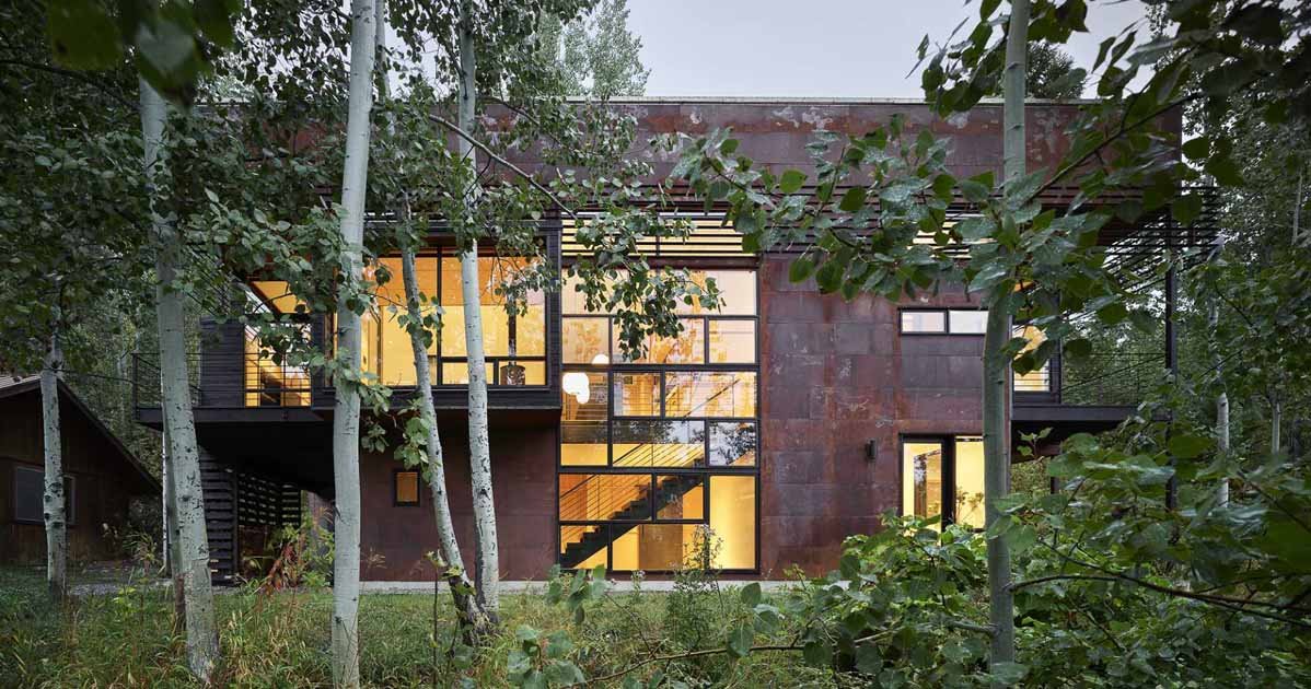 Located in a dappled Aspen grove, the home incorporates slow-weathering materials such as oxidized steel and cedar, allowing it to change its appearance over time.