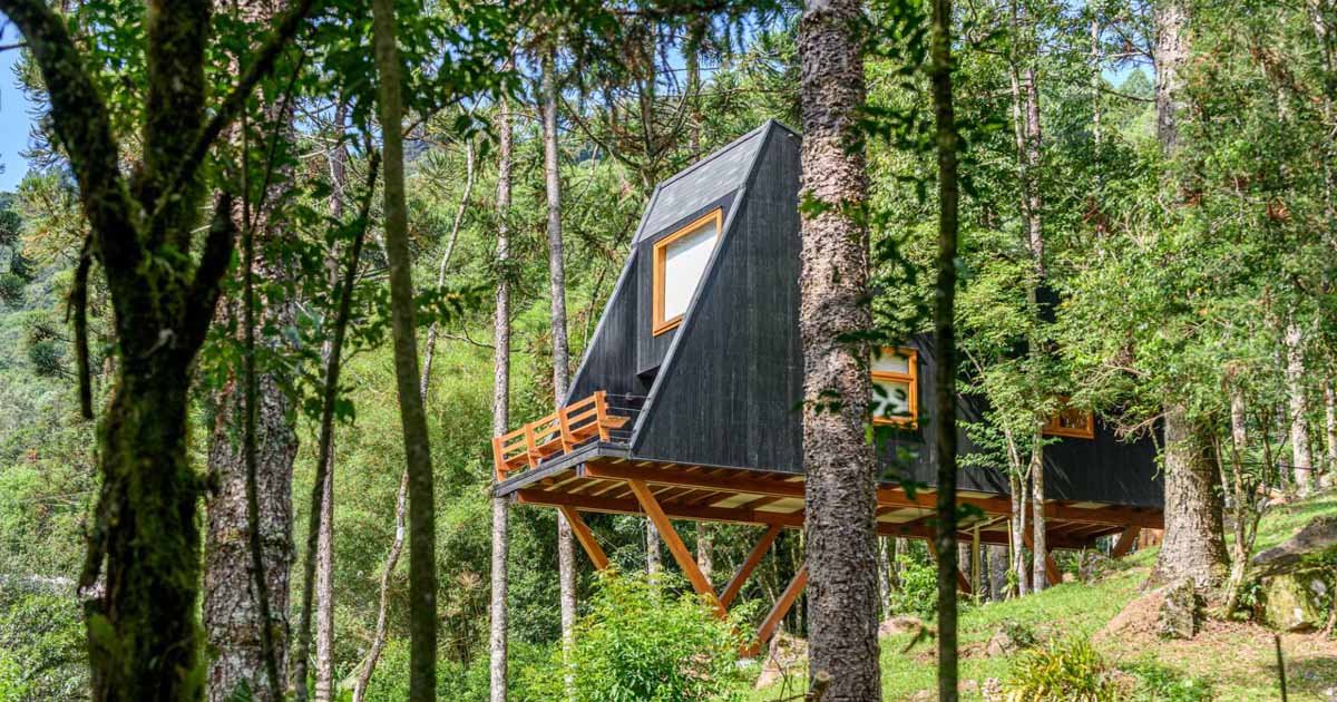 The Tree House which has the feeling of ‘floating inside the forest’, is fully integrated with the imposing Araucaria trees typical of the Rio Grande do Sul mountains.