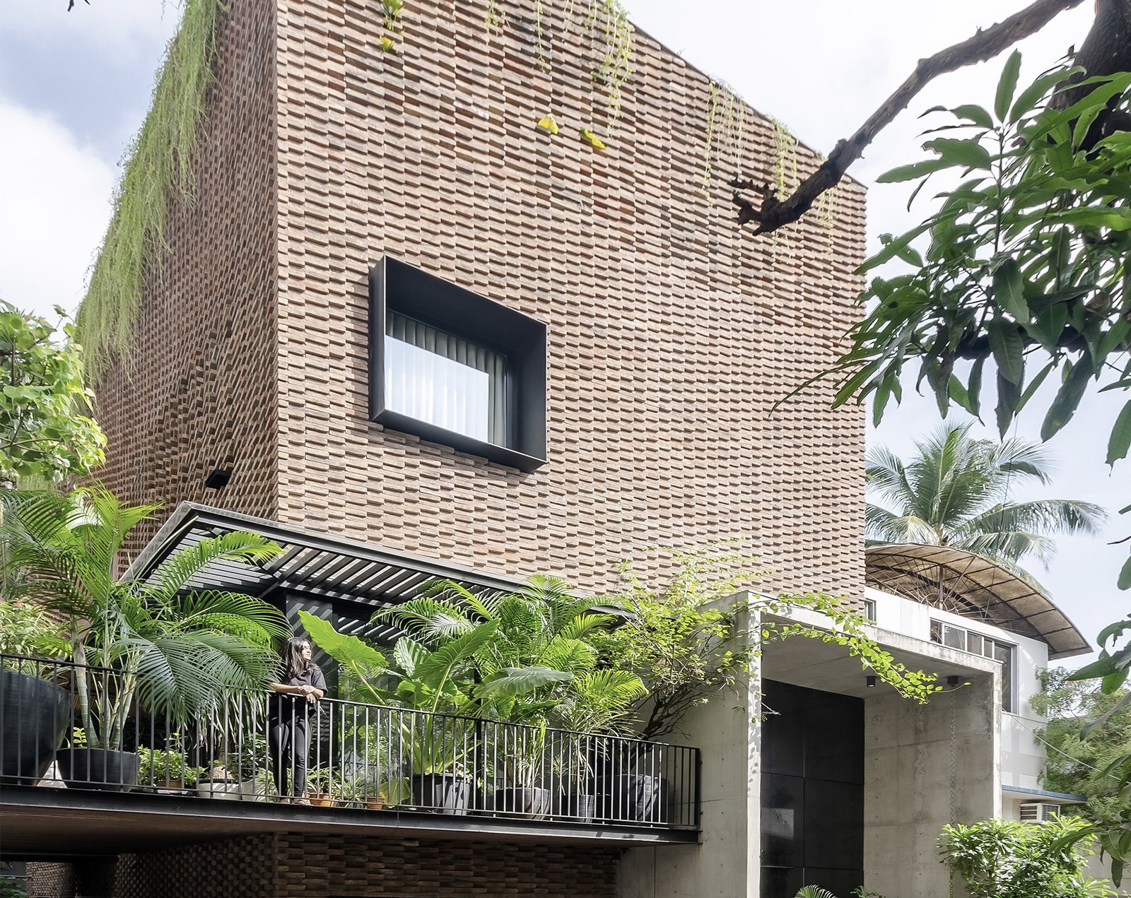 One of the considerations behind this façade design was its climatic condition. Since it orients toward the South-West, the idea of solid skin was to reduce the heat gain inside. The projections and offsets are designed in a manner so that 40-50 percent of the house remains in shade especially during extreme summers. Apart from this, existing trees played an important design decision factor for openings. An age-old mango tree towards the south shares a large portion of its foliage, keeping the living areas shaded throughout the year. One can also enjoy this seasonal vibe from a bold window on the first floor and through brick cut-outs from the floor above.