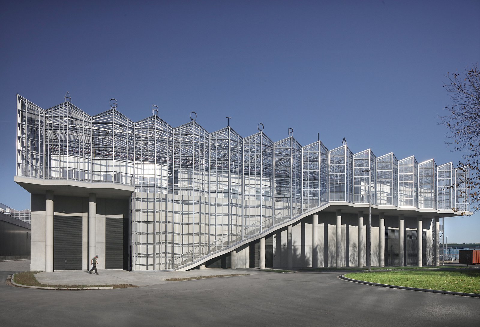 Text description provided by the architects. Rooftop greenhouse Agrotopia is Europe’s largest research center for urban food production. With its faceted glass facades, monumental entrance staircase, and stacking of functions, Agrotopia gives a striking architectural appearance to horticulture on the roofs of the city.