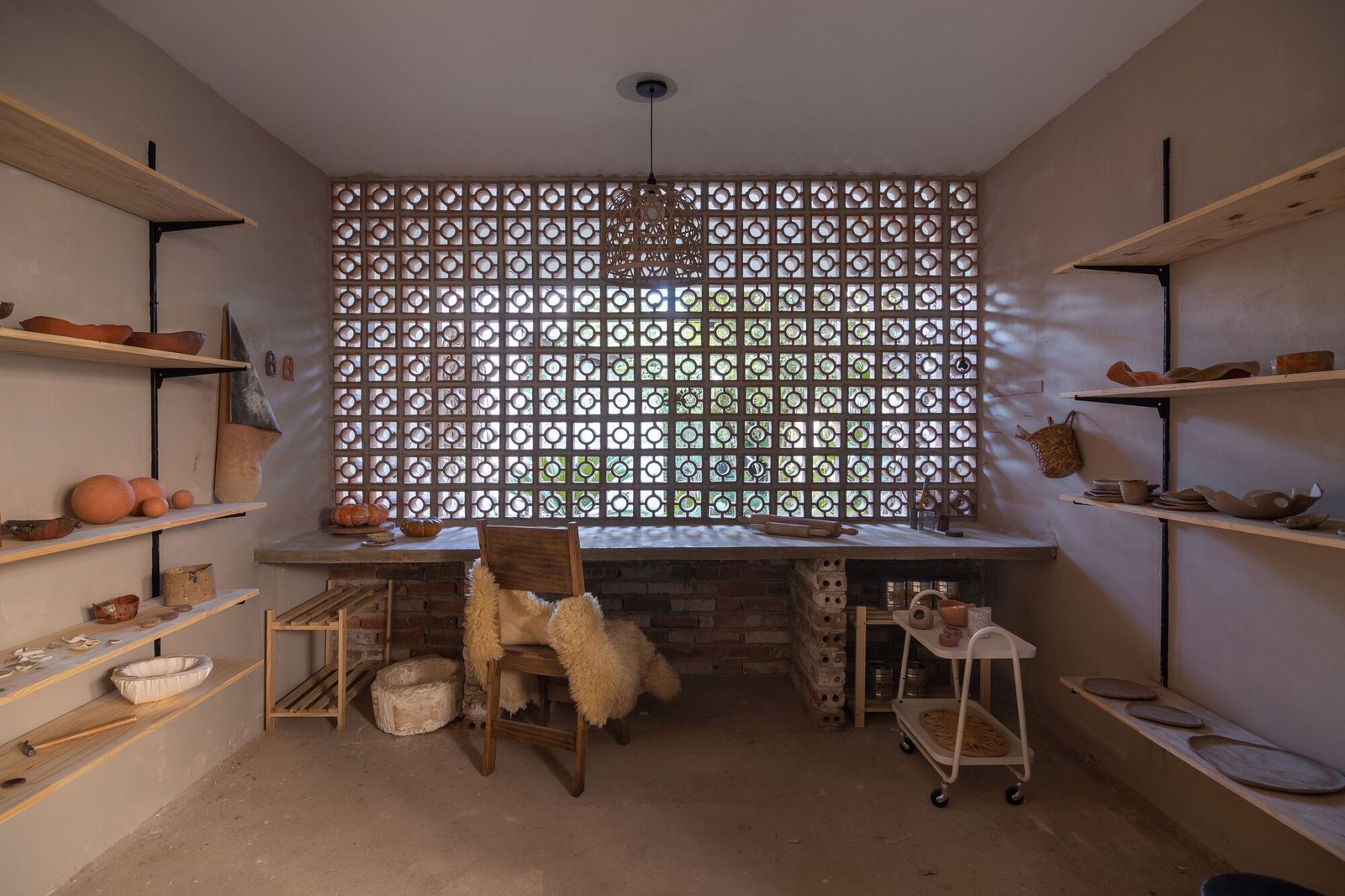 It is in the memory of a time that the workshop space takes place, and it tells its story without censorship. The large concrete tables are porous – from the ceramic and stationery area to the pantry counter.