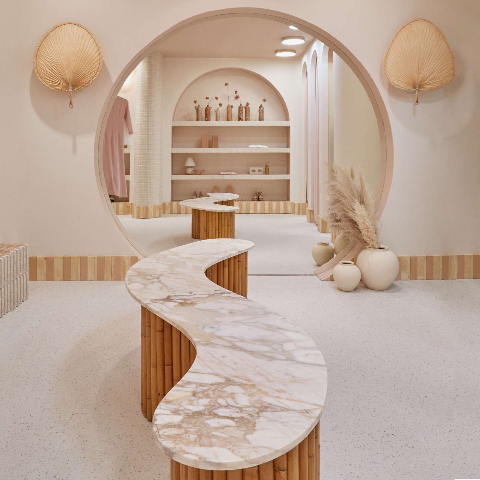 Arched partitions, natural stones, concrete blocks, terracotta, gresite, and natural rattan where we wanted to reflect all the work done by hand, in addition to the delicacy of the basics with something special, creating a timeless space. The people who enter will be picked up by a harmonious space that integrates a sense of raw beauty while discovering the numerous collection of the brand through the exhibitors to reach a resort to the fitting rooms. The architecture and the garments dialogue with each other and tell a story of heritage and innovation. Earth colors have been chosen for the store’s furnishings in contrast to the warm tones of the ceiling and edges of the arches and baseboards. Travertine marble in combination with Portuguese pink marble is used for the central tables, counter, and bench in the fitting area. The entire store is finished with a skirting board created with clay pieces in different tones and placed piece by piece throughout the store. The lighting has been distributed to create a warm atmosphere and respect the shades of the garments.