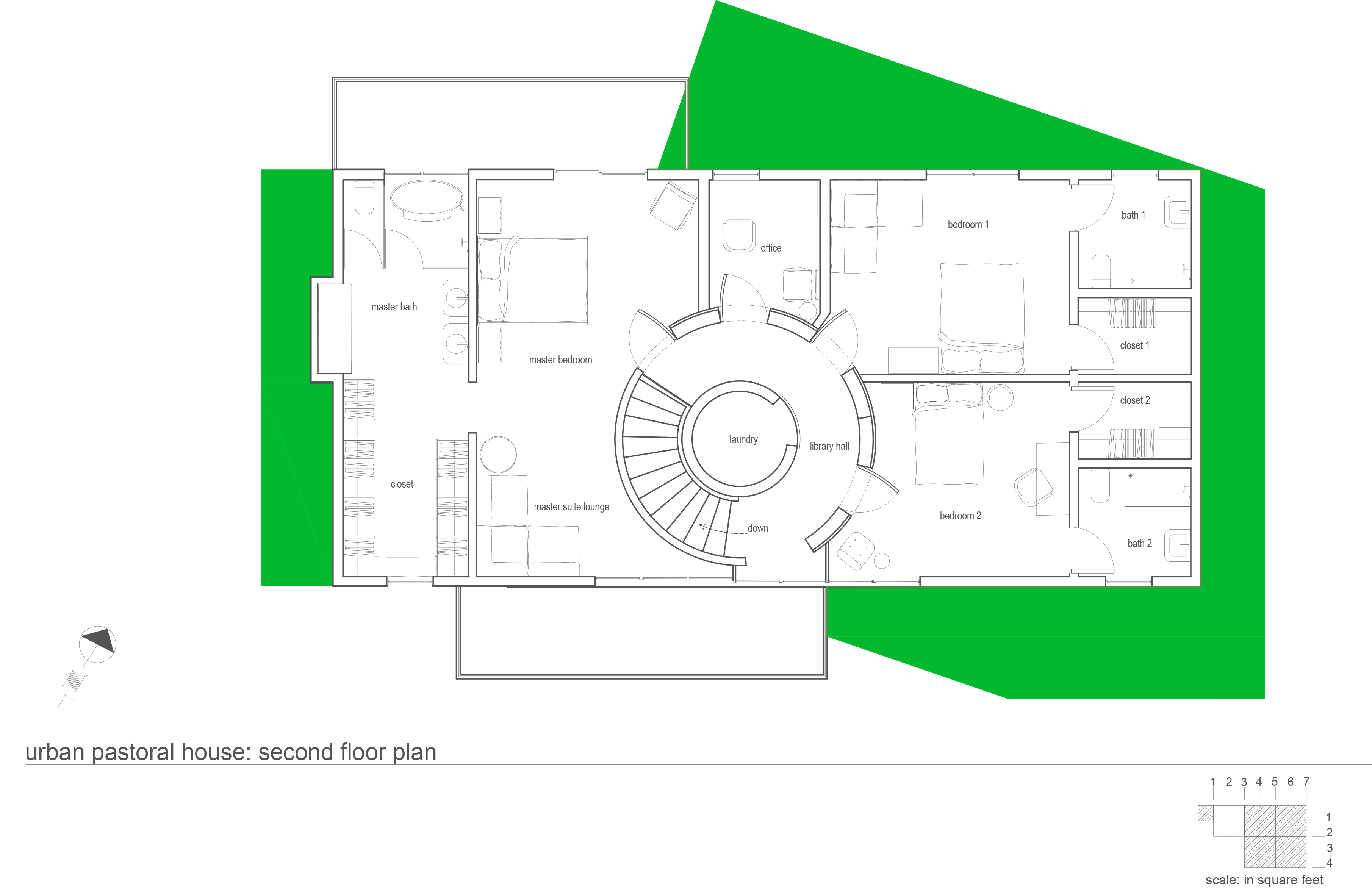 نظرًا لأن الضوء الطبيعي من الأعلى يوجه الشخص لأعلى ، فإن التسلق يخلق رحلة عبر مساحات المنزل. من الدرجات السفلية العائمة التي تظهر بشكل عضوي من غرفة المعيشة وتلتف إلى الأسطوانة الأولى ، إلى نقطة مراقبة فتحة المفتاح التي تنظر إلى الأسفل من الهبوط ، إلى المكتبة الساطعة الموجودة في أسطوانة أكبر في الطابق الثاني ، يسمح الدرج واحد لمواجهة واكتشاف علاقات مكانية جديدة داخل المنزل.