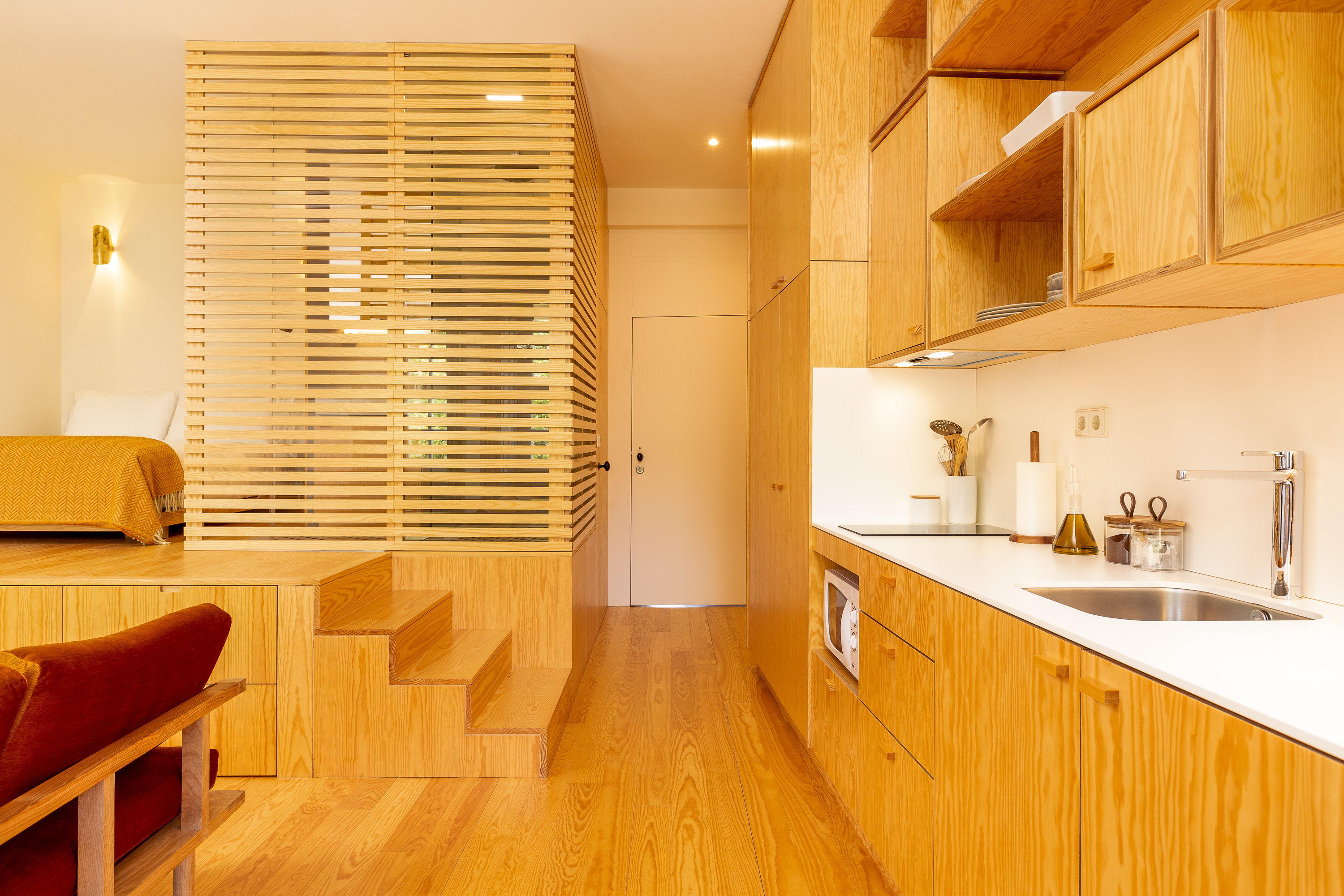 نظرًا لصغر حجم الشقق ، تم اعتماد الخشب كمواد مفضلة لتكوين المساحة وتحييدها.