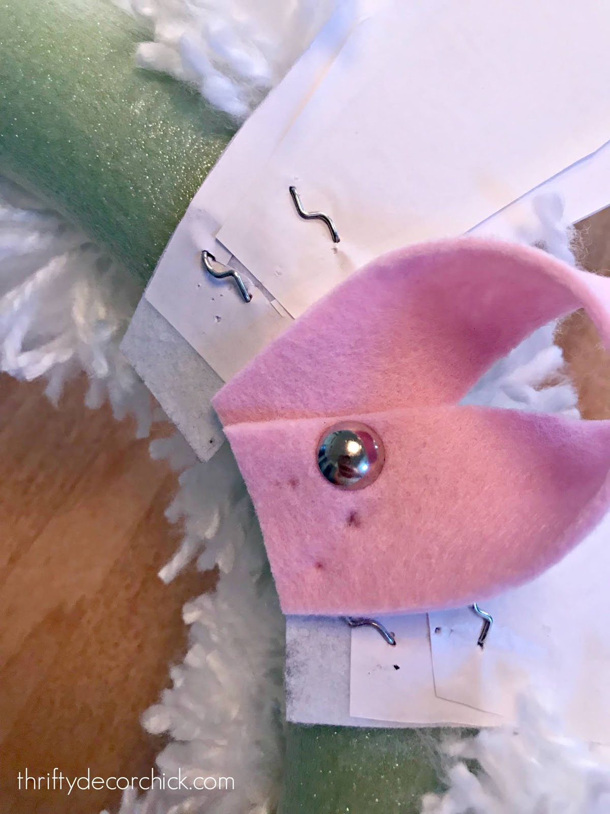 لقد قمت بربط الأذنين بالجزء الخلفي من شكل إكليل الزهور مع دبابيس الأزهار ، ثم استخدمت مسمارًا وبعض الغراء الساخن لإنشاء خطاف للباب: