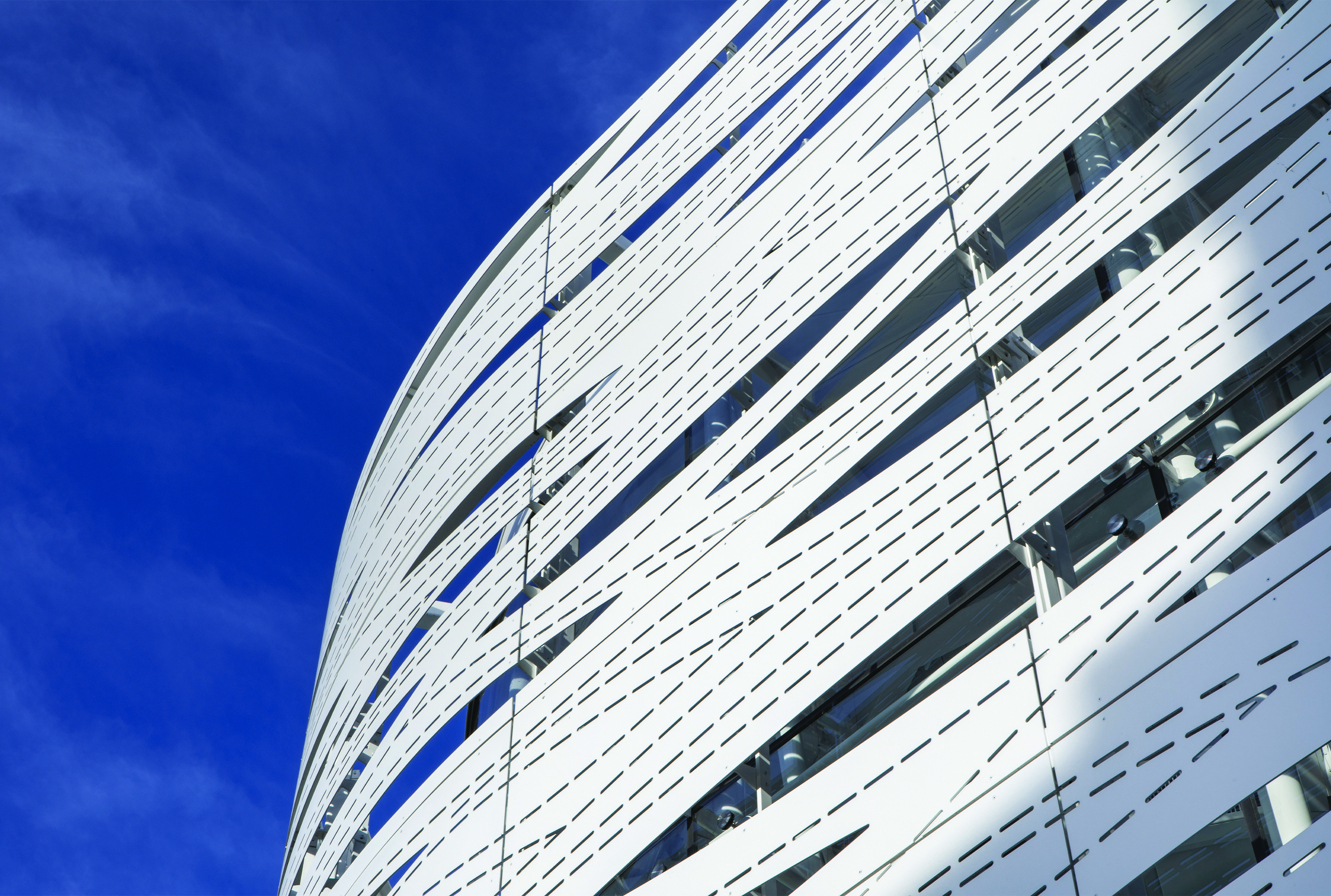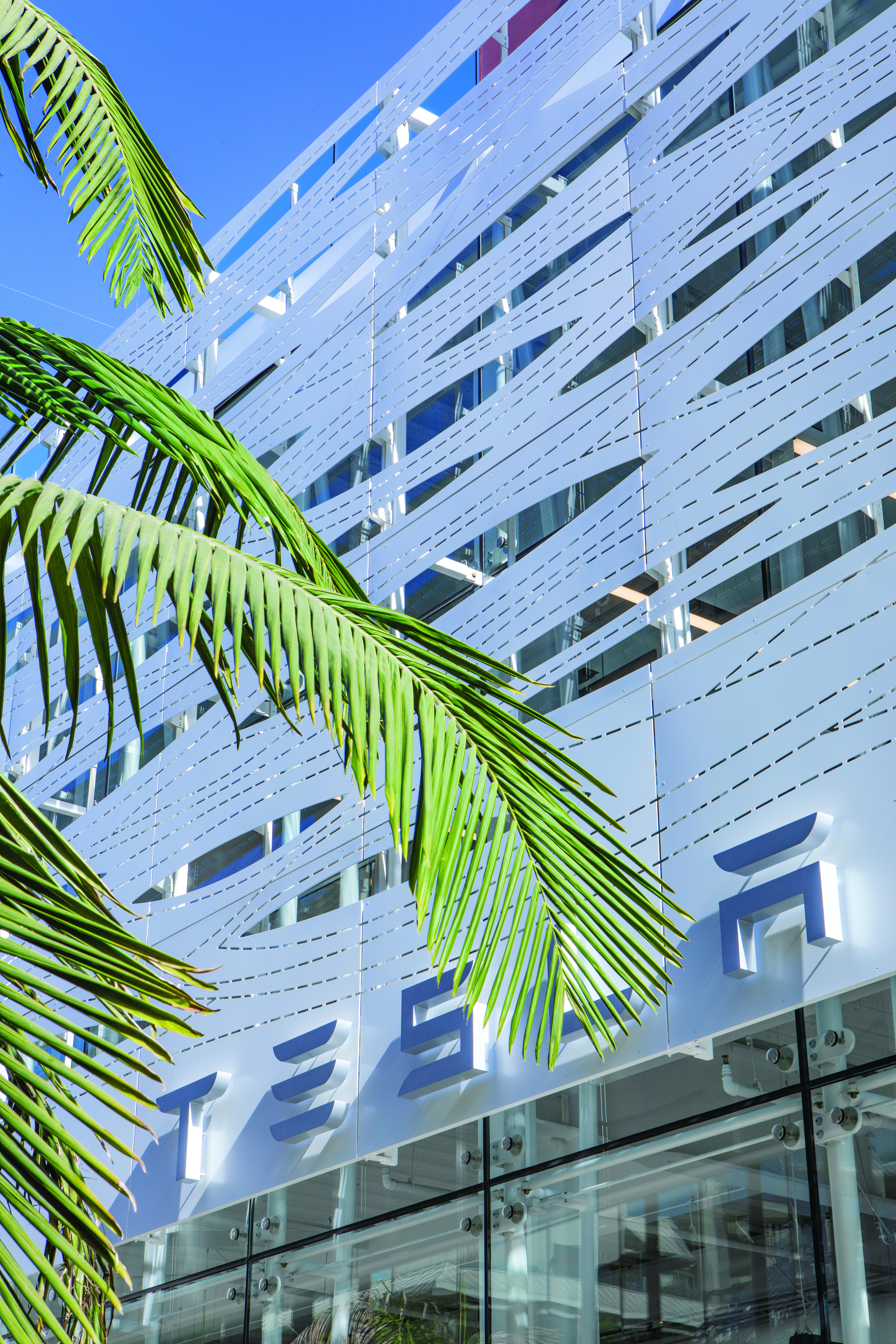 يتم توزيع الثقوب بشكل استراتيجي للتحكم في الرؤية والسماح لأشعة الشمس المفلترة بالمرور إلى الصالة وغرفة المبيعات في الطابق الثاني. عملت Arktura على تحويل الرؤية إلى واقع مع ضمان دمج الواجهة بسلاسة مع جدار ستارة زجاجي منحني بارتفاع 30 قدمًا ، مدعومًا على المواجهات وأعمدة الجمالون المنحنية المخصصة التي تم تطويرها لهذا المشروع.