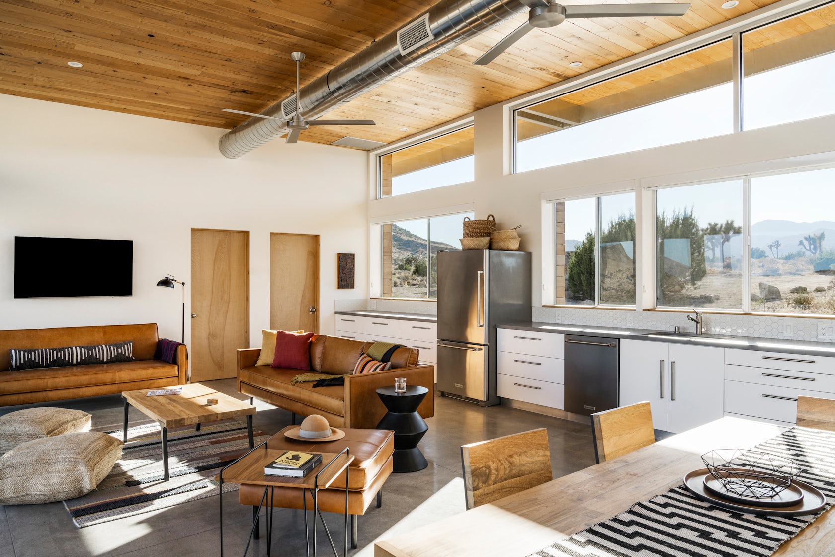 تطل النوافذ ذات النوافذ الكبيرة على إطلالات على الصحراء وتسمح بدخول ضوء النهار. يتألف المطبخ من جدار واحد من غرفة كبيرة ذات تصميم مفتوح ، محجوزة بغرف النوم والحمامات. تظل مساحة المعيشة الرئيسية خالية من الجدران وأي حواجز أخرى للسماح للرياح بتهوية المنزل بشكل سلبي. تلعب المفروشات دورًا في موضوع التقاء الغرب القديم بالحداثة.