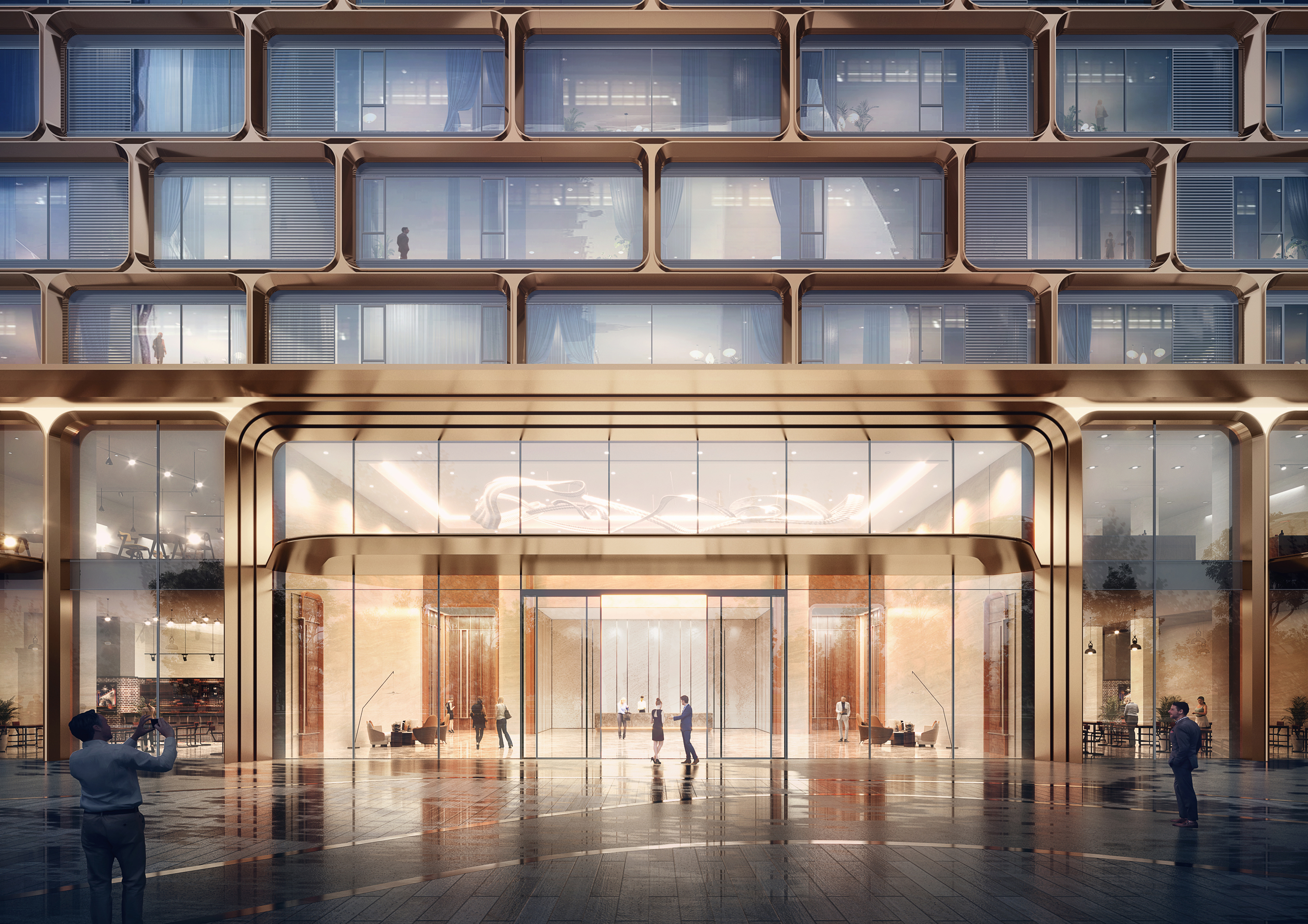 بدأنا من الاعتبارات التفصيلية وقمنا بتغيير تركيبة وحدة خياطة فريدة ورائعة لتغليف المبنى بأكمله ، ووضع طبقة ذهبية على الهيكل العظمي للمبنى. تعمل لوحة الألومنيوم الذهبية ثلاثية الأبعاد على إحداث تغيير في سطح المبنى. تشكل المساحات الكبيرة من الزجاج ومكونات الألمنيوم المكرر واجهة بناء عالية الجودة ومعروفة للغاية تتناسب مع موقعها البيئي.
