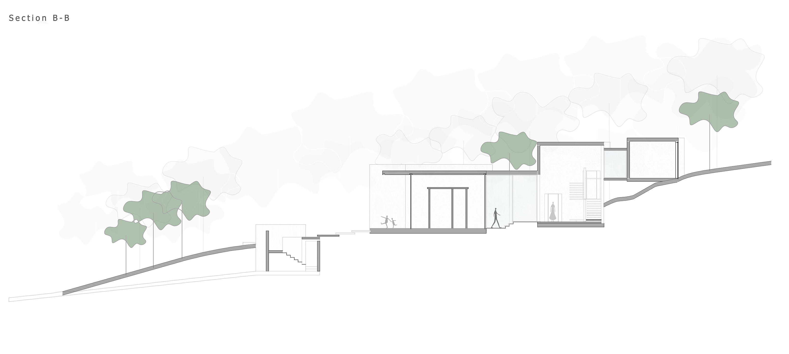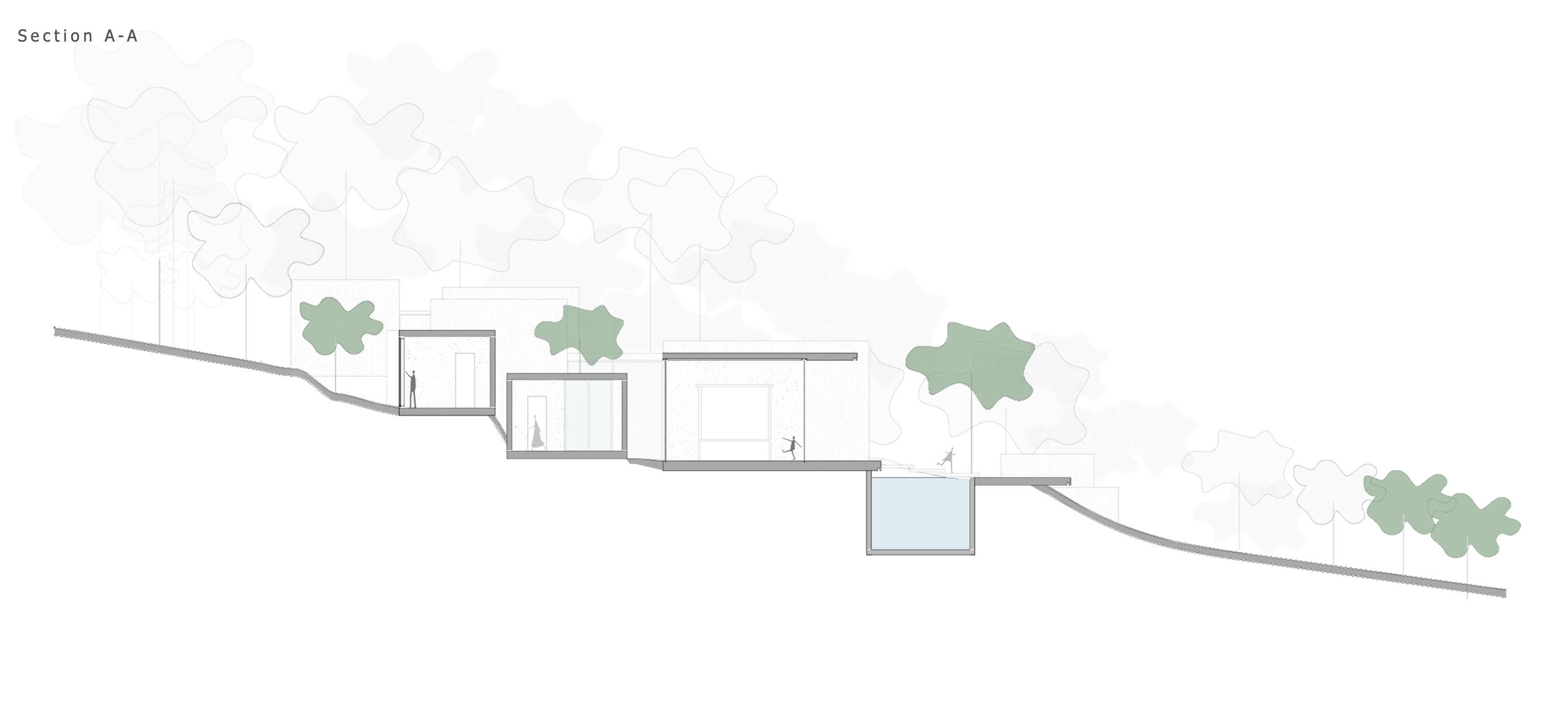 لذلك تم وضع الحجم على طول منحدر مرتفع. المشكلة الأخرى كانت احتياجات العميل ، والبحث عن مساحات منفصلة تمامًا للخاصة والعامة. الحاجة إلى مساحات مستقلة جنبًا إلى جنب مع المساحات التفاعلية ، تم إنشاء مجموعة من المساحات الفرعية داخل المنزل ، بما في ذلك المساحات الخاصة وشبه الخاصة والعامة.