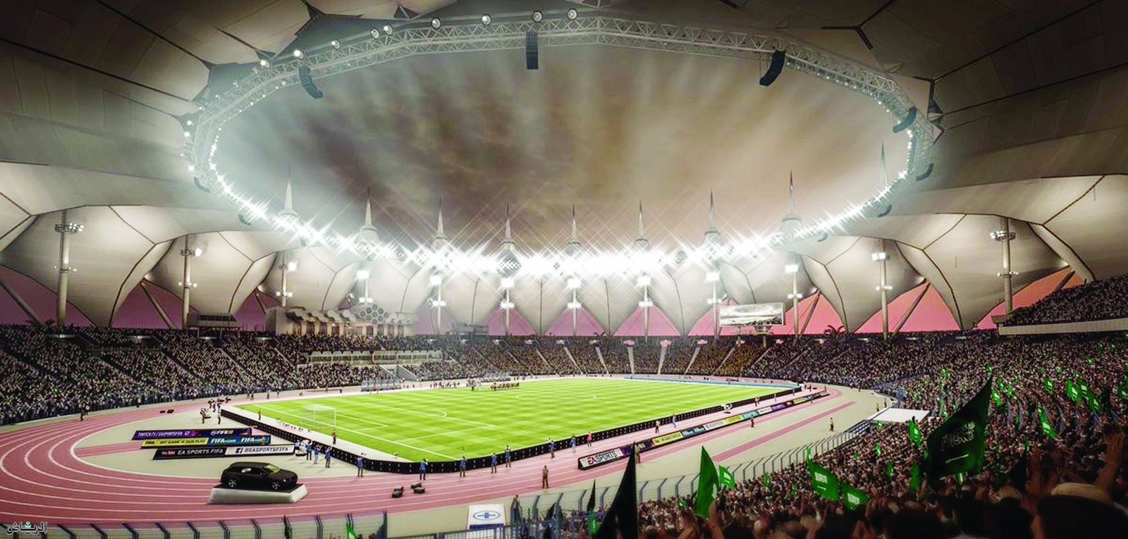 صممت الشركة البريطانية إيان فريزر وجون روبرتس وشركاؤه الملعب كملعب لكرة القدم الدولي لكرة القدم يستوعب حوالي 70 ألف متفرج. يتكون بناء سقف الملعب من عدد من الوحدات المصنوعة من الألياف الزجاجية المطلية على شكل خيمة مدعومة بالكابلات.