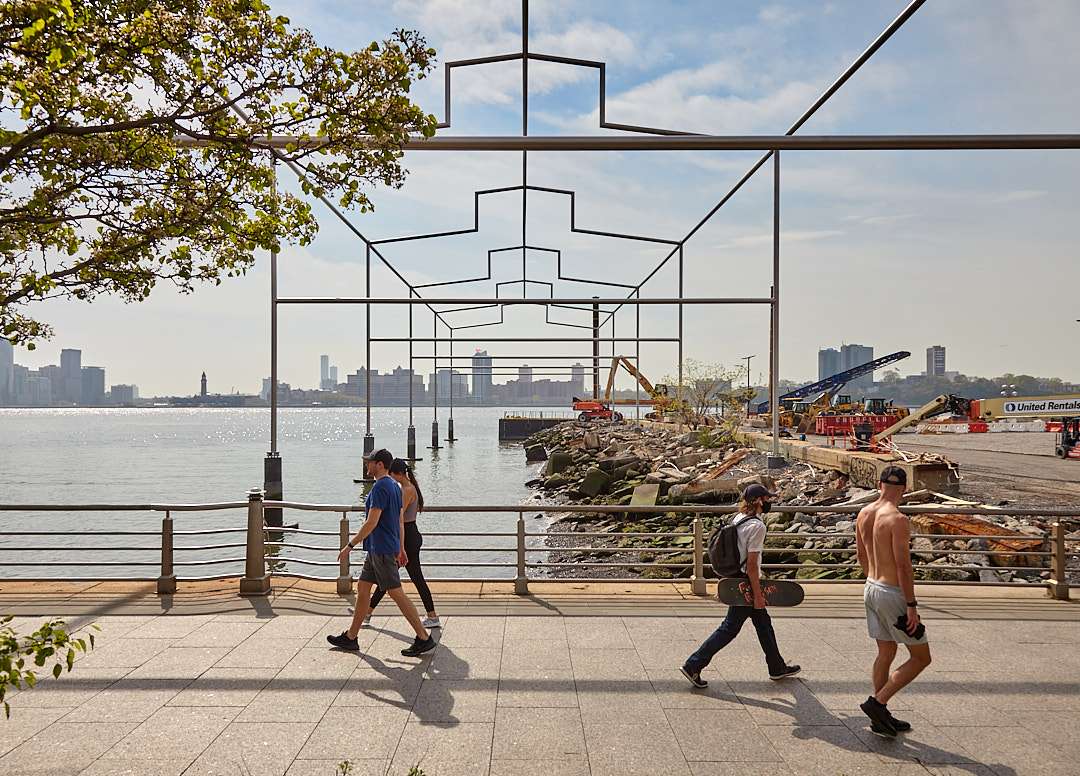This minimal waterfront installation traces the ghostly outline of the demolished Pier 52 building, honoring Gordon Matta-Clark’s radical 1975 work while reframing the site’s cultural memory. Its skeletal stainless-steel frame dissolves into the skyline, inviting reflection on history, absence-+ and renewal.