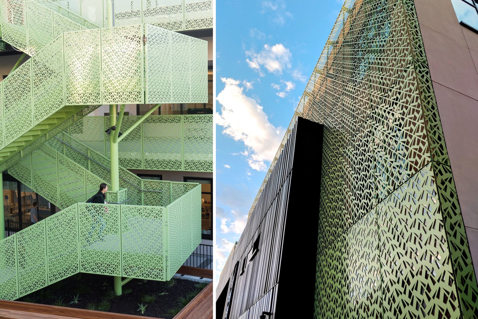 Turning structural staircases into textural focal points, BŌK Modern fabricated their panels from 14GA steel with a primer and powder-coated finish for durability. Specified in the A26 pattern across all solutions, the finished products elevate the staircases beyond essential elements of the complex while letting the student’s art installations shine.