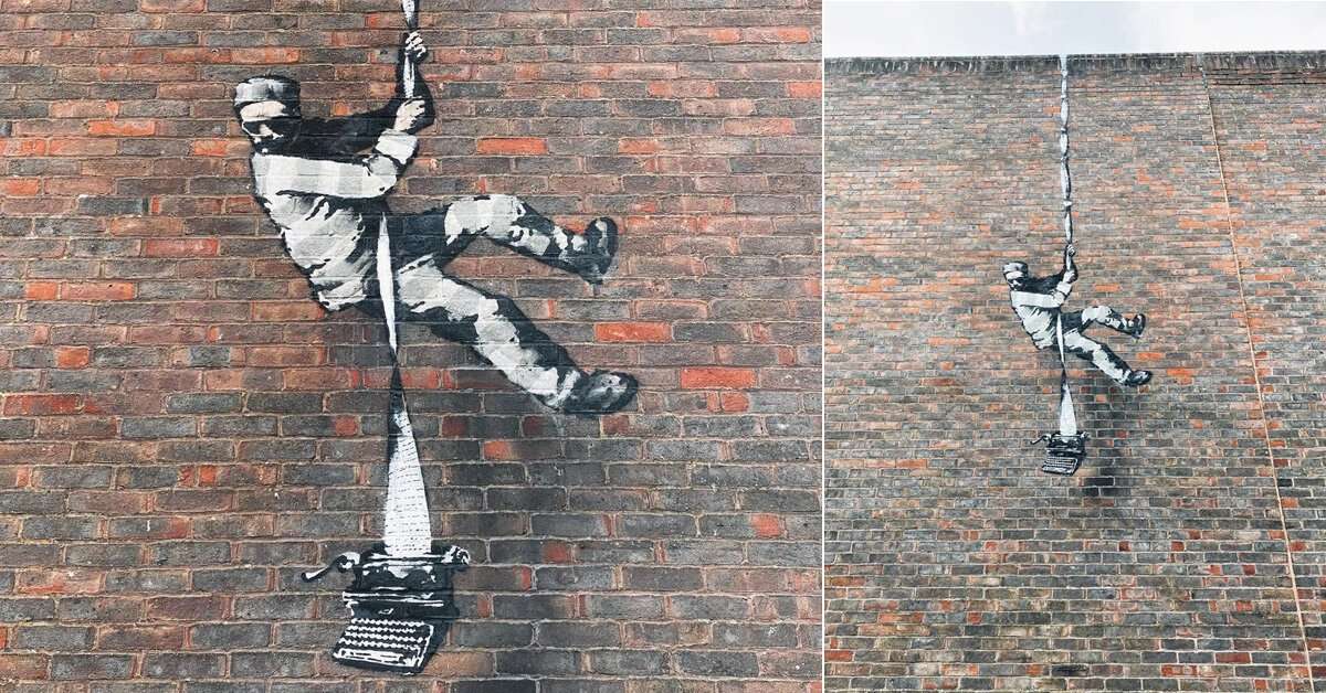 banksy has struck again, this time taking over the wall of england’s reading prison, an out-of-use institution which once held oscar wilde. the mural showcases an inmate making an escape over the jail’s wall, hanging from a rope made of knotted sheets attached to a typewriter.