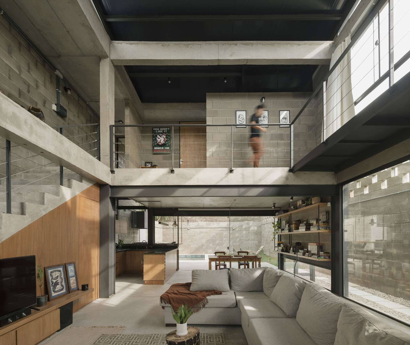 In this first housing configuration, for a couple and their pets, an open social area for meetings and games, an en-suite bedroom, a study and a guest bedroom are distributed in 150 square meters. These spaces were located according to the orientation of the plot and the vertical void ratios that decompress the main volume, to capture natural light and optimize ventilation. Thus, on the ground floor, the divisions are limited, and on the upper floor, there are two closed blocks facing each other. The whole complex is separated from the boundary to the north, by a linear patio, and is closed to the south, protecting it from abundant rains. The upper intimate blocks form a double-height between them over the social area, with a zenith opening that allows ventilation, letting the hot air escape from the interior of the house. The open side retreat indirectly illuminates the spaces and ventilates them, in addition to fulfilling the function of the passage of the facilities (sanitary and electrical), in the future with abundant vegetation accompanied by a block filter, which reduces solar incidence. In the same way that the structure is apparent, the blind walls were executed with pre-molded blocks, these blocks, in addition to reducing the execution time, require fewer accessories that improve their thermal inertia, since they have an air chamber inside.