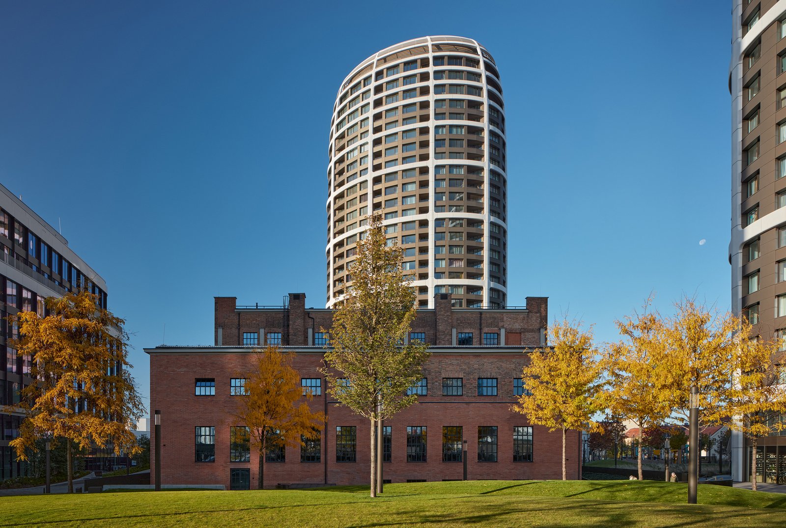 A new five-story building was placed in the interior of the boiler and turbine hall, creating new space. Other industrial elements of the heating plant were also used to pay homage to history – the entire interior is dominated by concrete hoppers, with the original crane forming the atypical open ceiling of the shared office. The architectural entrance in the form of a neologism is the work of the DF Creative Group studio. The PAMARCH, specializing in the protection and reconstruction of monuments, oversaw the building envelope renovation.