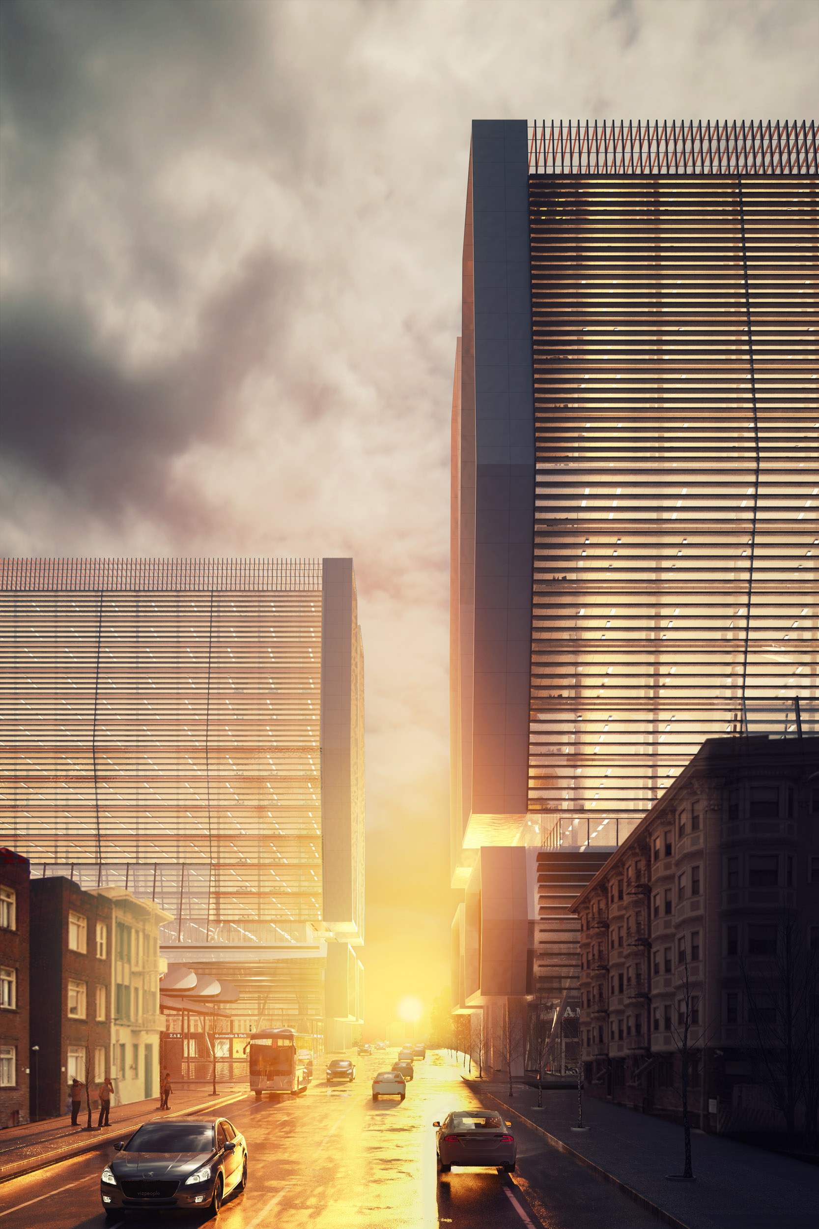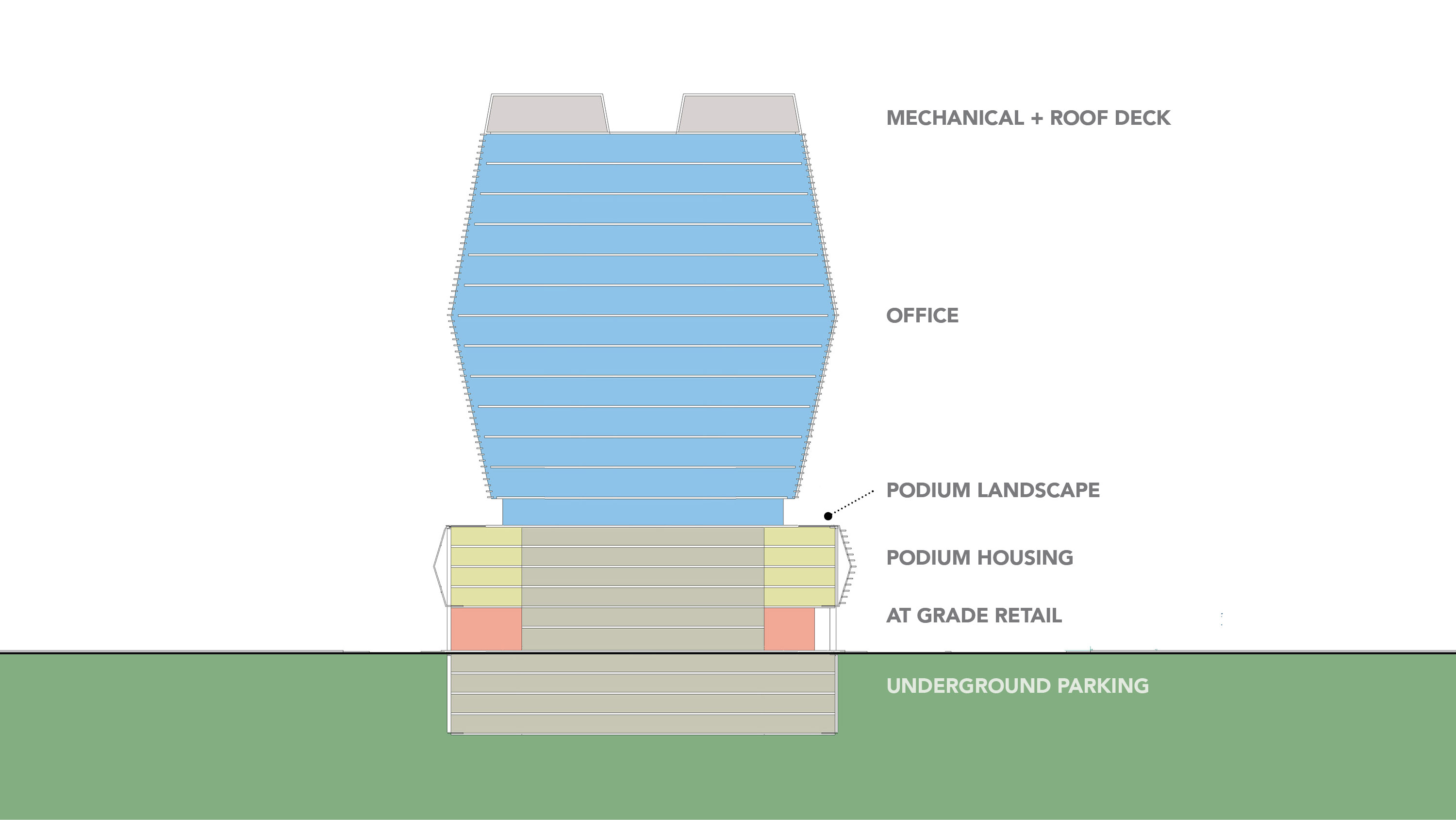 Intrinsic to the design of the two buildings are deep overhangs and extensive horizontal sun shading to moderate the California sun. The 275-foot tall buildings each contain 13-floors with 600,000 square-foot of office space, 200,000 square-foot of housing, and 50,000 square-foot for retail.