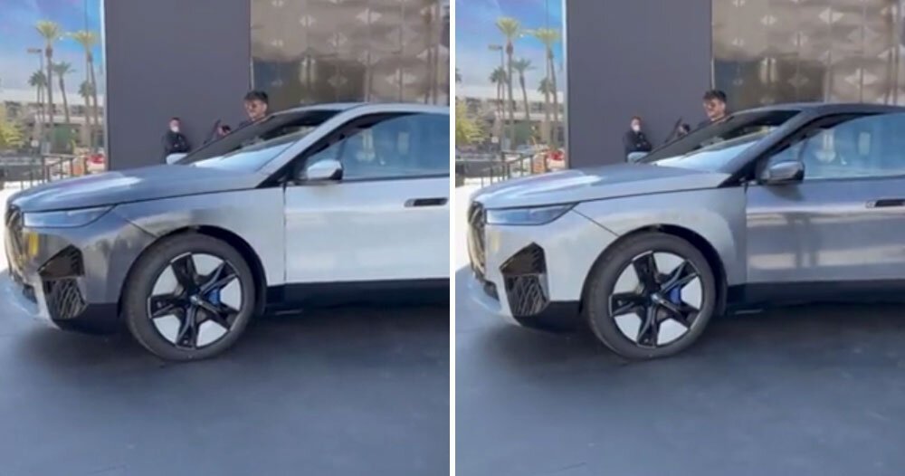 BMW arrives at CES 2022 with a splash, debuting its all-electric iX bathed in a color changing paint. the sidewalk demonstration was captured by onlookers and shared on social media — showing the car fluidly transform from dark grey to white, seemingly after being activated inside.