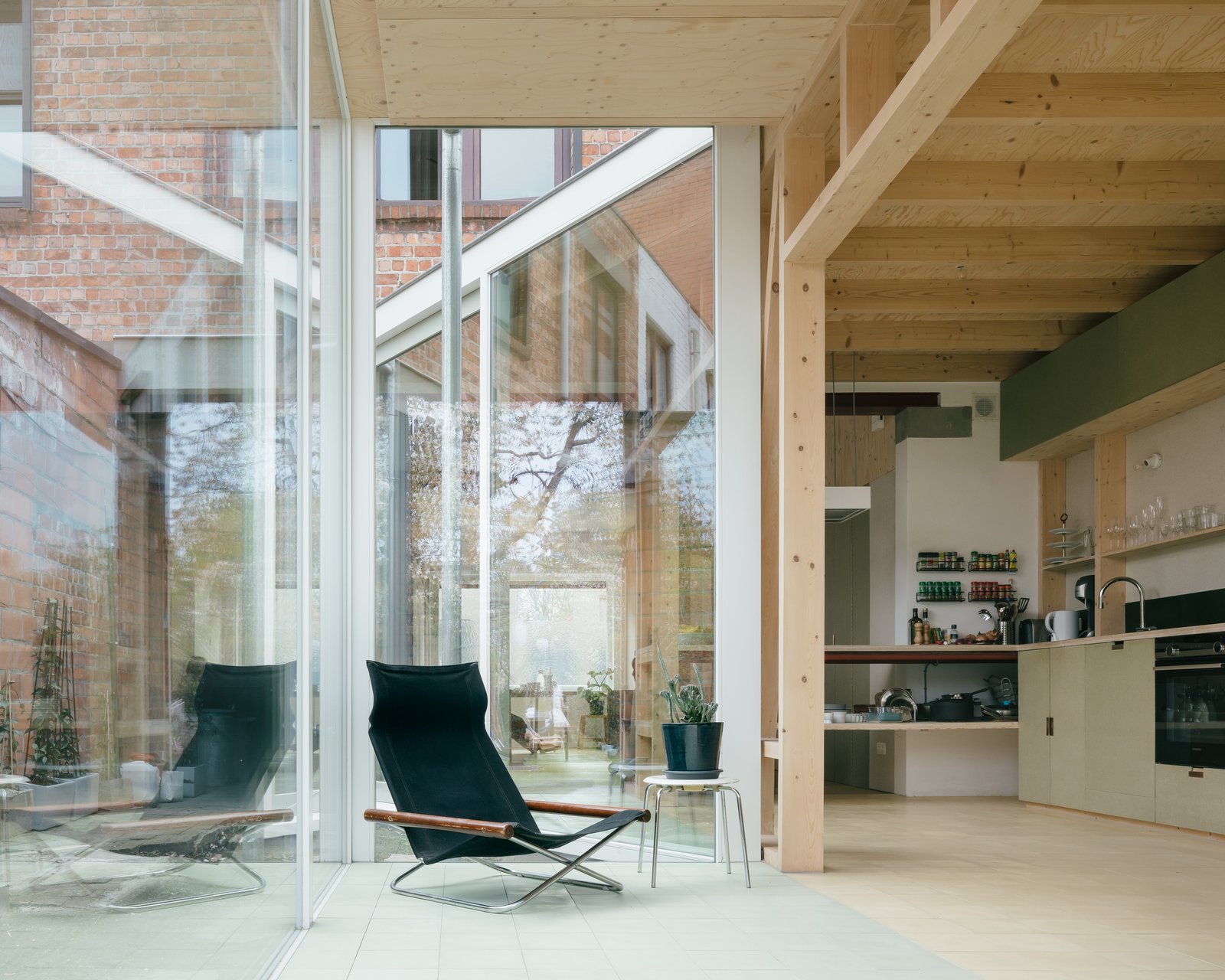 The ramshackle annex is torn down but returns as a light wooden support structure that cantilevers to form two ‘bay windows’. The whole is wrapped by a wooden window assembly. The wooden structure determines the interior. Everything – functional or esthetical – is born from it: a rack dividing two spaces, a bench, the kitchen furniture, or the wall pattern.