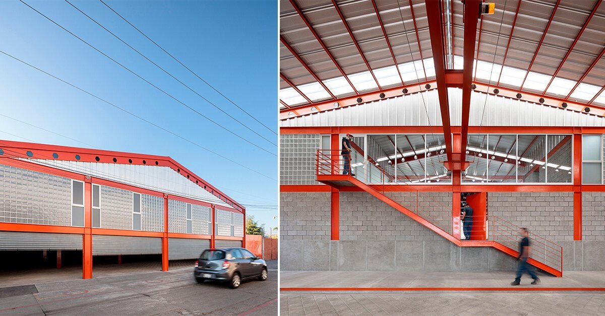 Architect Emilio Alvarez Abouchard completes the FM warehouse in Morelia, Mexico, as a naturally-lit industrial facility with a bright orange coating. The structure sits adjacent to an existing steel foundry meant to grow in space and can be accessed from the site’s north and south streets.