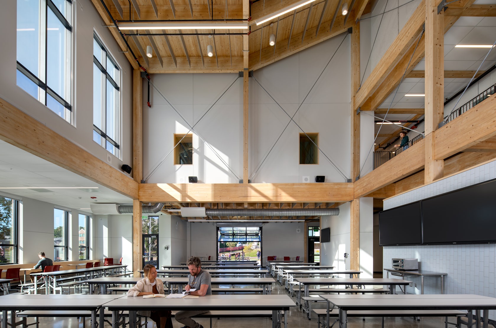 While the previous layout left both academic and vocational programs fragmented across campus, students, faculty and the community are now united in the Student Commons, a center for activity on campus built of heavy timber framing.