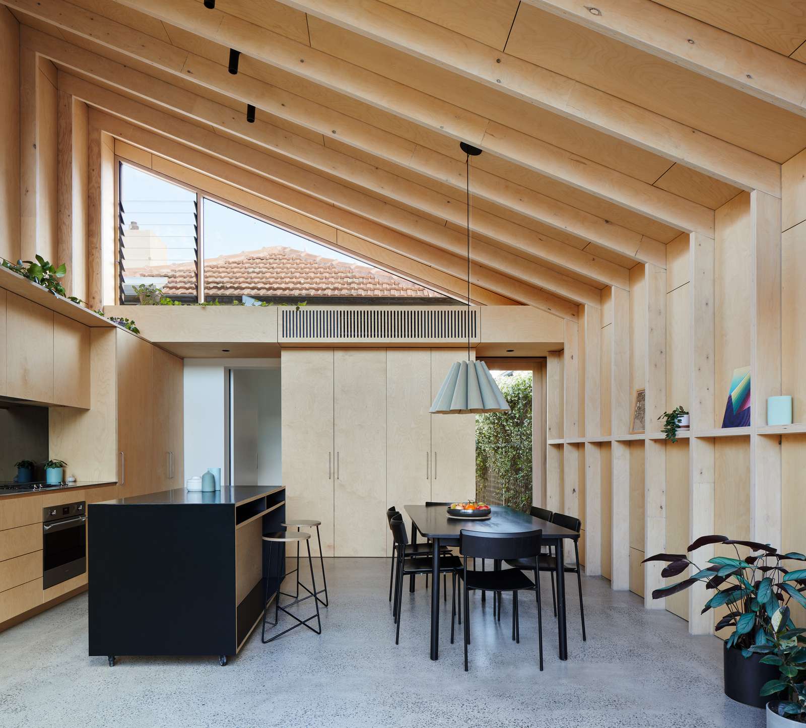 An all plywood interior provides warmth and detail, an unexpected and pleasant surprise after the long walk from the front door through the all-white original house with ‘frilly’ original period details. The timber structure is expressed and accentuates the dramatic raked ceiling. The space is flooded with light from the northern façade which is fully glazed, and from the high level window on the southern side. The southern window also allows for cross ventilation and provides a view back to the original tiled roof of the old house beyond.