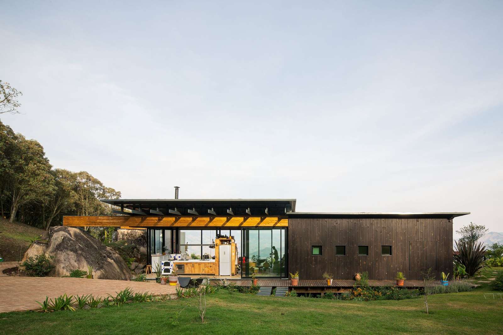 It’s a beam it’s a void. The main beams of the house are from CLT (Cross laminated timber) and are 14 meters long, with a total visible span that opens frontally to the panoramic view of the Pedra do Baú. From a structural arrangement and frames that open the span, the house appears to float without support and fully opens to the surroundings. On one side the beams are supported on the stones and on the other on the steel frame closed block.