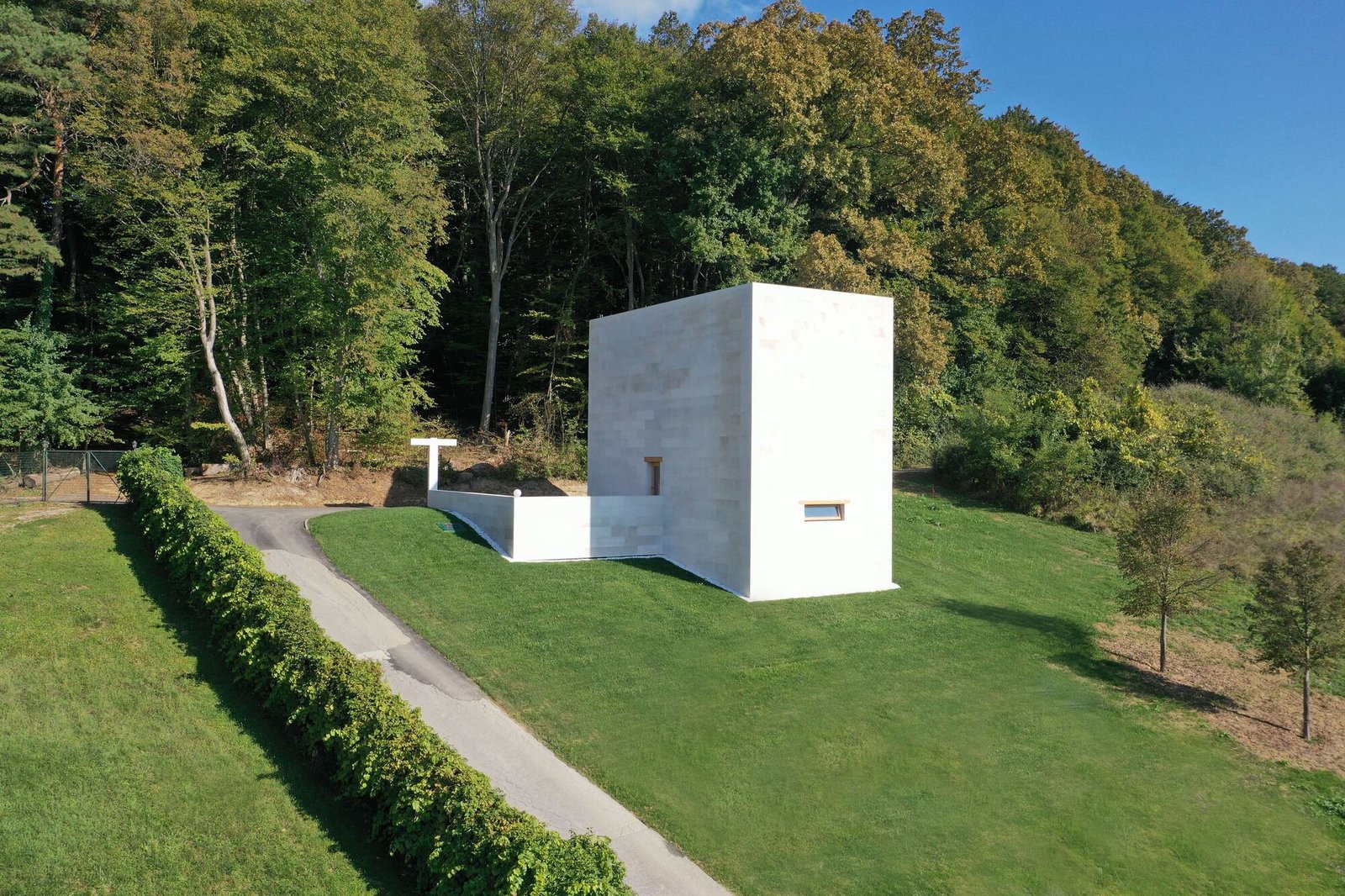 A monolithic, almost completely enclosed volume lined with limestone slabs, was built into the slope of the highest part of the estate. This closeness to the environment indicates the ascetic introversion of the chapel. However, the architect designed a transitional area between the natural and the artificial as a terrace – a piazzetta – with a view of the hilly Zagorje region and rows of bluish mountain ranges in the background. The more one will feel the transition to another world – the world of meditation and spirituality. The edifice itself is marked by the duality of its materiality: the outer borders made of natural, cut stone material and the inner skin of cast concrete. In terms of reduction to the most basic, the technology of making visible concrete determines the image of the interior. The only “decor” is the formwork of the shell and recesses for its fixing. The strict purity of the author’s approach might perhaps remind us of early Christian church buildings; in terms of tradition the past is immanent in the present. Clearly, there is no doubt about the modernity and even the actuality of exactly such minimalist design.