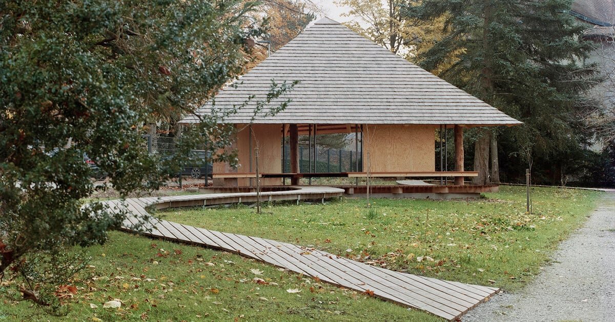 Swiss architect Charly Jolliet’s work is deeply rooted in local tradition. Instead of striving for novelty, he seeks authenticity and honesty, a combination reflected in his construction methods and communicated through detailed drawings expressing architectural simplicity and trust. Expanding on his authentic architectural approach, Jolliet recently completed the meditative and wood-clad ‘Umbrella Pavilion‘, which opened in April 2023 to mark the launch of a new sector at the Fribourg botanical garden in Switzerland.