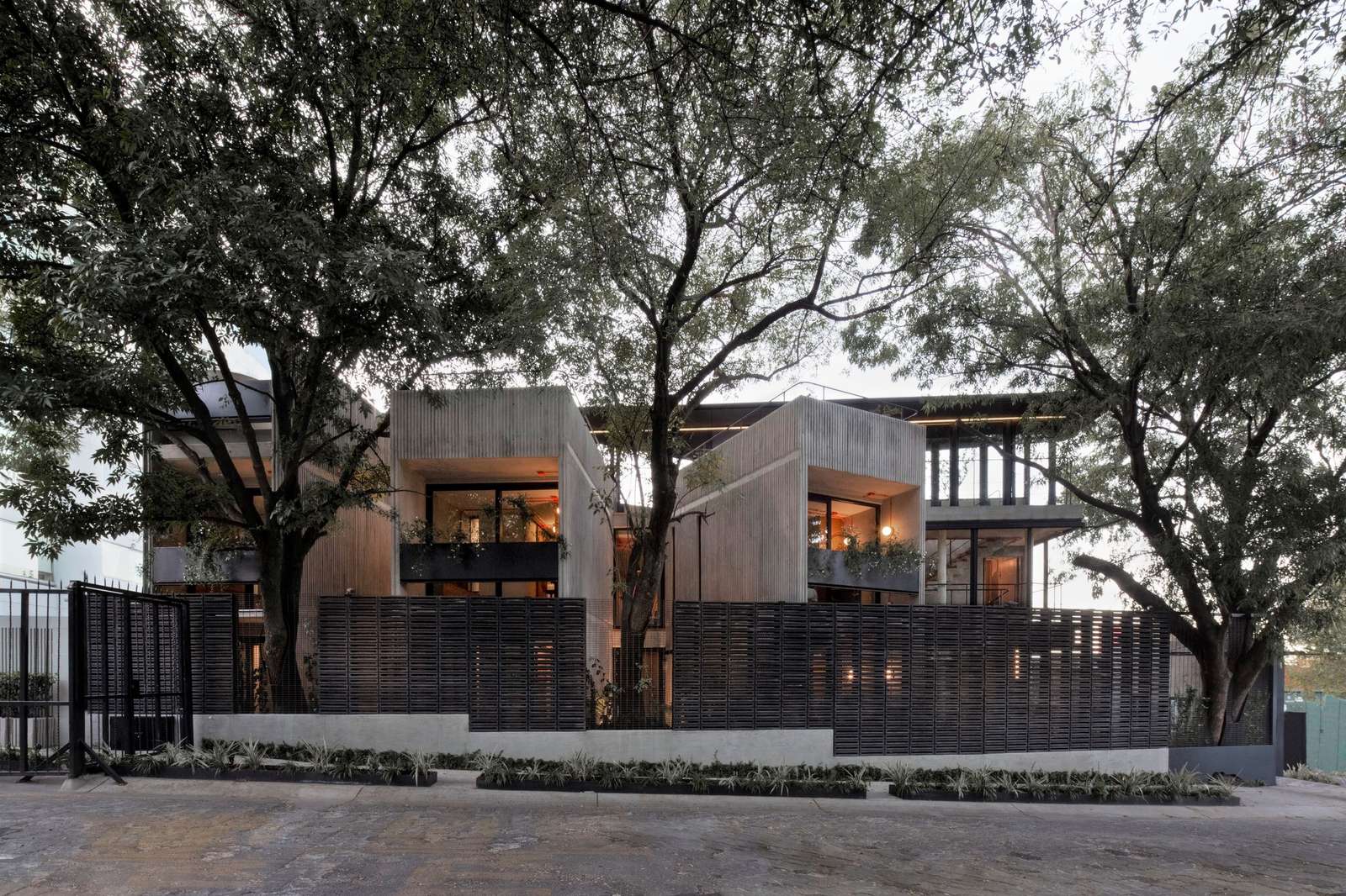Technical and constructive challenges. Coliving Interlomas is the result of a completely artisanal approach to the procedure and relationship with exposed concrete. During the construction process, several technical trials were held to achieve the final corrugated concrete effect. Formwork trials with different types of metal sheets and wood were made until the ideal technique, in which none of the corrugated waves peeled off, was achieved. This is the reason why the corrugation is slightly slanted, instead of at a straight 90º angle. The landscape design was thought as a green productive system, with vegetation such as: passionflower, lime, lemon and guaba. This means to put forward a healthy lifestyle that goes beyond aesthetic function. It was important to think of spatial structures that would help the co-habitants of the project to have a more direct relationship to the vegetation and its produce. Anyone can eat the apples or oranges that have been planted and harvested on site.