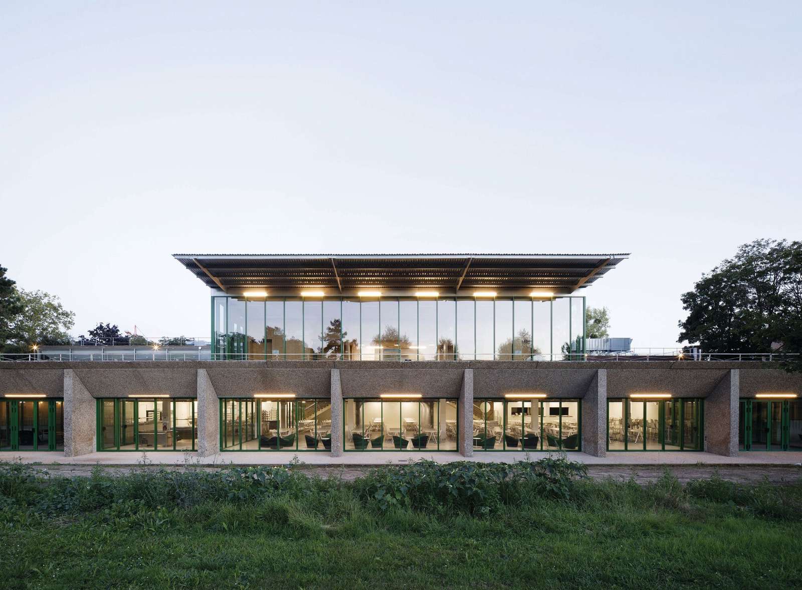 On the existing side, the kiosk deploys an opaque technical band covered with a reflective cladding of corrugated sheet metal identical to the roof, interacting with the entrance. On the park side, the refectory area opens entirely onto the landscape through a transparent and rhythmic envelope made of a curtain wall of green spines. These elements, aligned with the original structure, are positioned in the continuity of the new glazed façade of the plinth, like a unique and assertive mesh. Designed as a light pavilion on a topographic mineral base, the kiosk becomes a unifying element between the different parts of the refectory, allowing it to assert its presence while ensuring the architectural coherence of the whole.