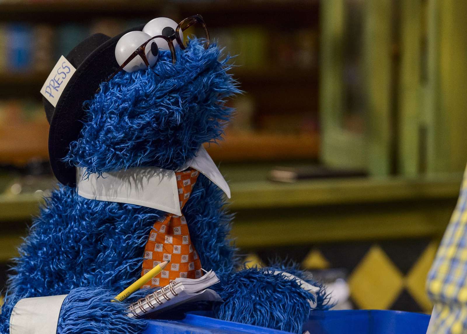 Cookie Monster as a journalist on Season 49 of Sesame Street (photo by Zach Hyman, courtesy of Sesame Street)