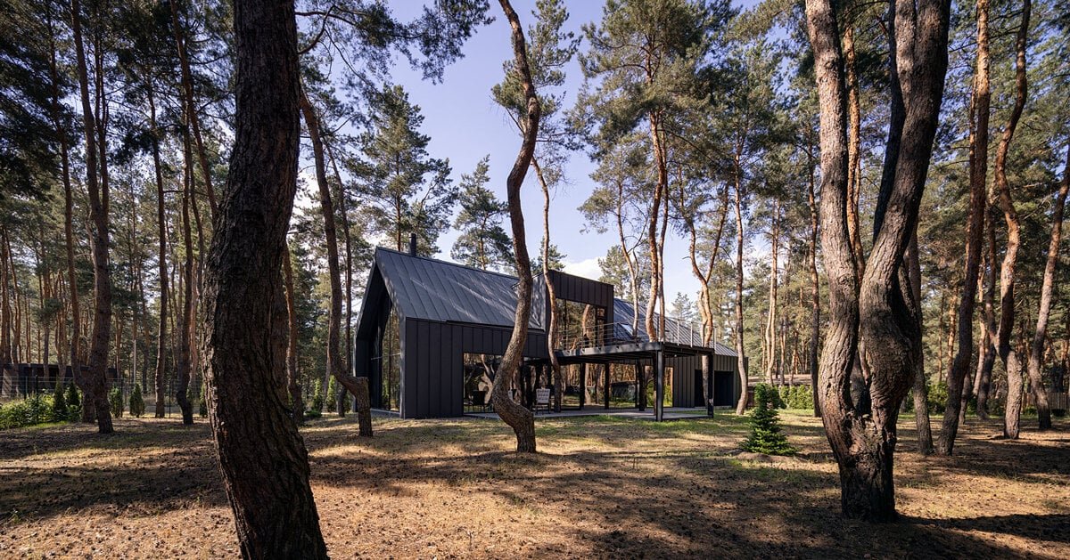 dark metal and wood cladding wraps gabled ‘house among the pines’ in ukraine