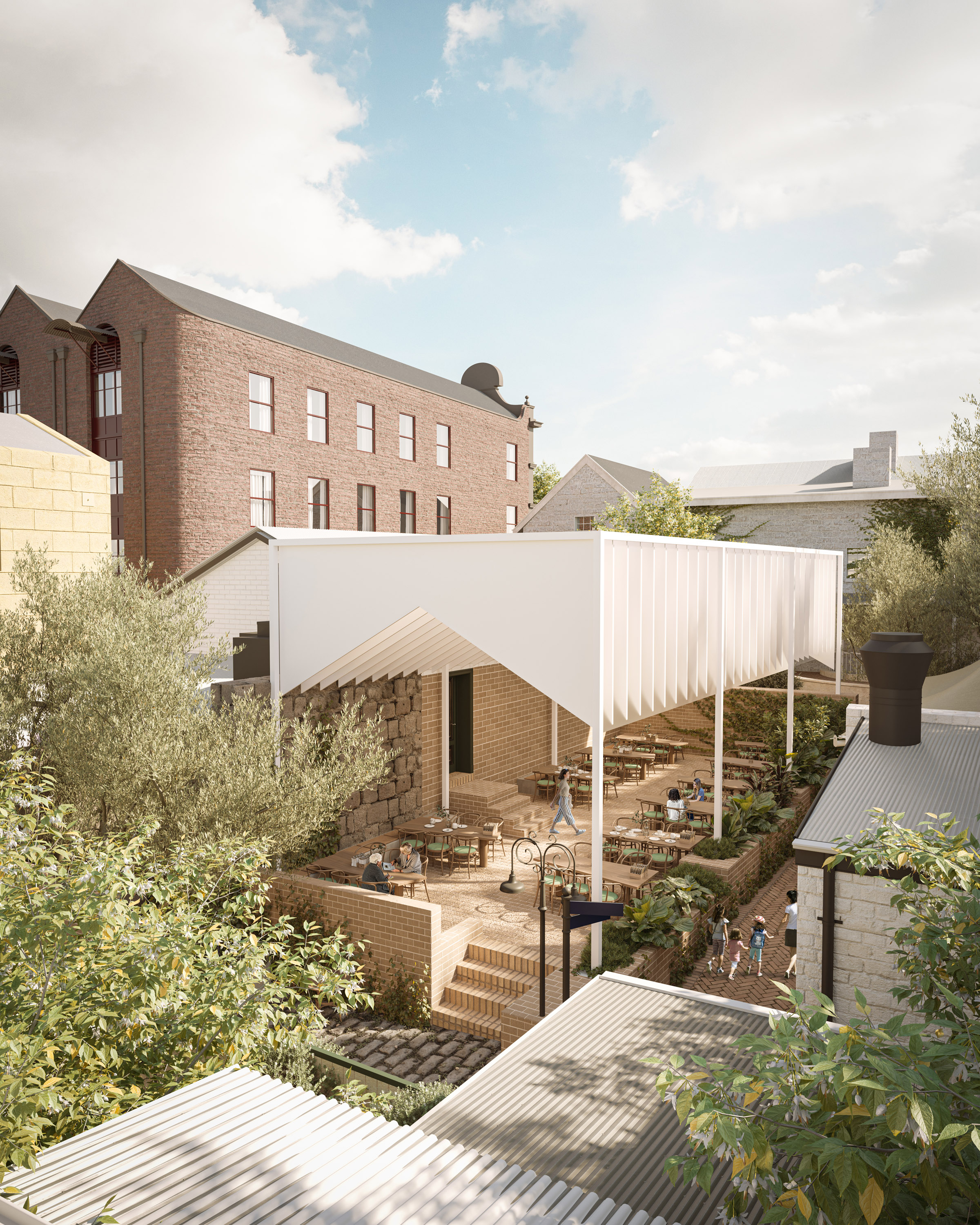 The old lean-to roof is replaced with a striking structure that references the pitch of surrounding roof gables in a repetition of steel trusses. The assembly adds height and volume to the courtyard and a generous civic structure to the heritage laneways. Beneath the steel frame, timber lining adds warmth, while operable timber louvres mediate direct sun and shield from the elements..