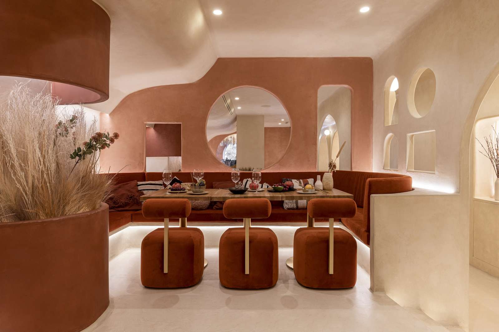 Talking a little bit more in detail about the forms and materials from Living Bakkali, at every moment organic forms contrast with each other, while an adobe effect is created on walls, floors and ceilings, using 1 unique material for the entire design, executed completely by hand like for the houses from the past that are aimed to be represented here. Above, a more neutral, but slightly contrasting color palette that clearly reminds us to the dessert has been applied. Last but not least, the created lighting effects, aim to highlight the mysterious and beautiful Orient to be discovered.