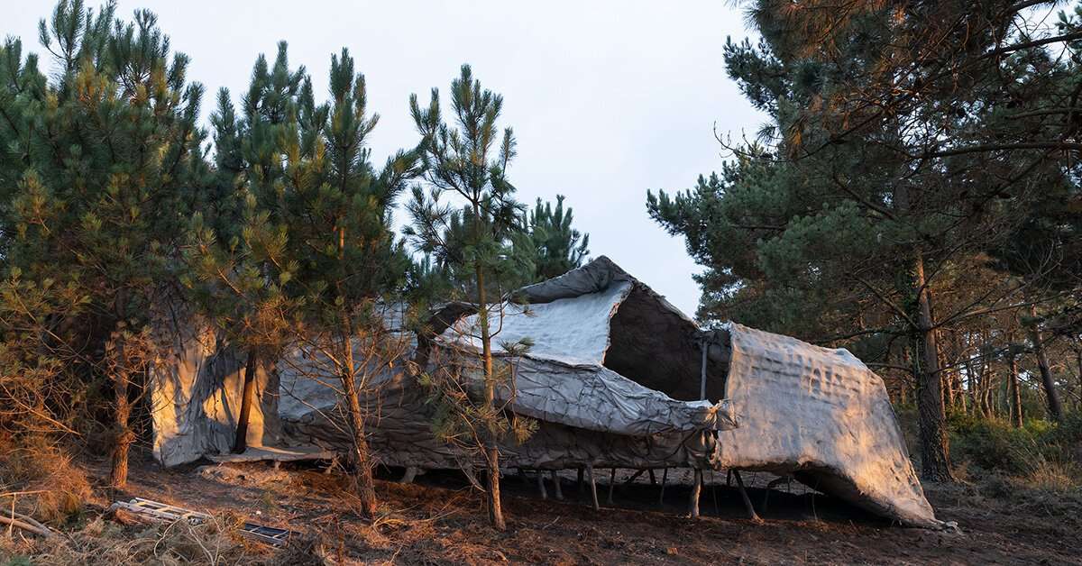 once ready, after layers of flexible folds stiffen, the tent by ensamble studio sits in tranquility between the trees and overlooking the sea while it waits for nature to shelter her and receiver her as one more.