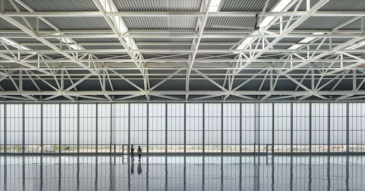 the private terminal at valencia airport was a challenge both at a structural and functional level. when it came to spatial organization, the design team at ERRE arquitectura has divided the program into two main areas: the working and hangar area. the first one is distributed over two floors between which double heights are created, generating interesting visuals. on the other hand, the hangar layout can host different aircraft as well as warehouses.