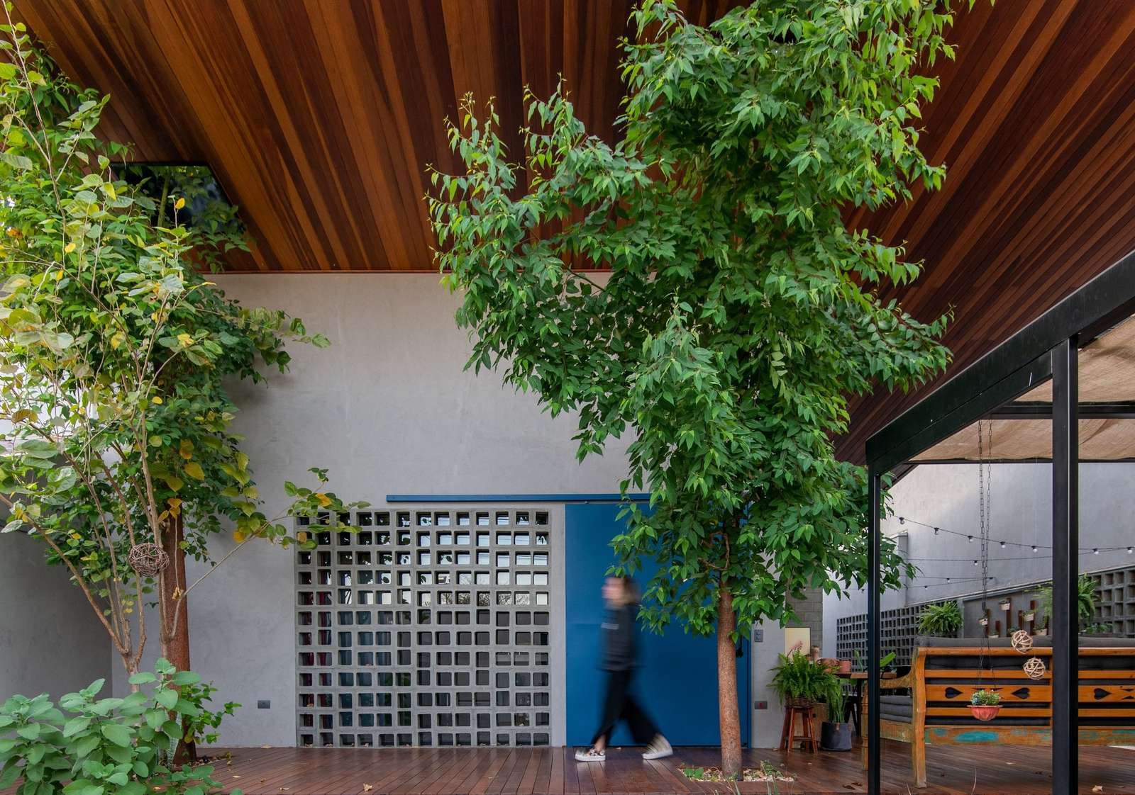 When they handed us the land, the first thing they told us was: we want to preserve the eucalyptus trees, the fruit tree, the palm tree, and whatever else. From there, we understand that construction would be a supporting role and nature would have the main role. We use, and value, the materials in their natural version (the exposed block on the walls, the cobogós made from the block itself, the small tiles on the floor with historical details, the ceiling and deck in mixed cedar, and the furniture in demolition wood), which brought us a lot of identities.