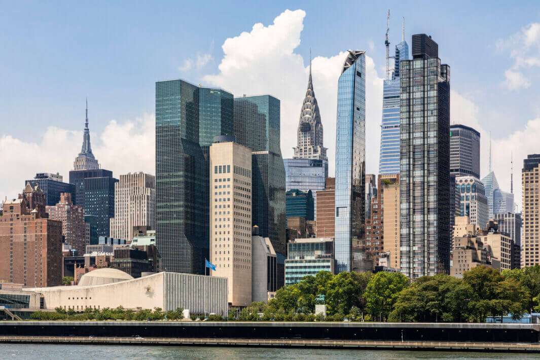 The Turkish House, a 561-foot-tall skyscraper designed by Perkins Eastman, has officially debuted on a stretch of First Avenue in Manhattan opposite the United Nations known as Consulate Row. Per a press announcement, 180,000 square feet of the 220,000-square-foot Midtown high-rise serve as new offices for the Permanent Mission of Turkey to the United Nations and the Consulate General of the Republic of Turkey in New York. The remaining 40,000 square feet are dedicated to residential space. Also included are a consular branch office, exhibition space, auditorium, conference center, and prayer room. The shimmering, 35-story glass tower features a curved facade inspired by the Turkish flag, a tulip-shaped crown that pays homage to Turkey’s national flower, and other design elements that reference the country’s rich history and culture while setting the building apart from the “surrounding cityscape of rectilinear skyscrapers.” Construction work on the Turkish House kicked off in September 2017.