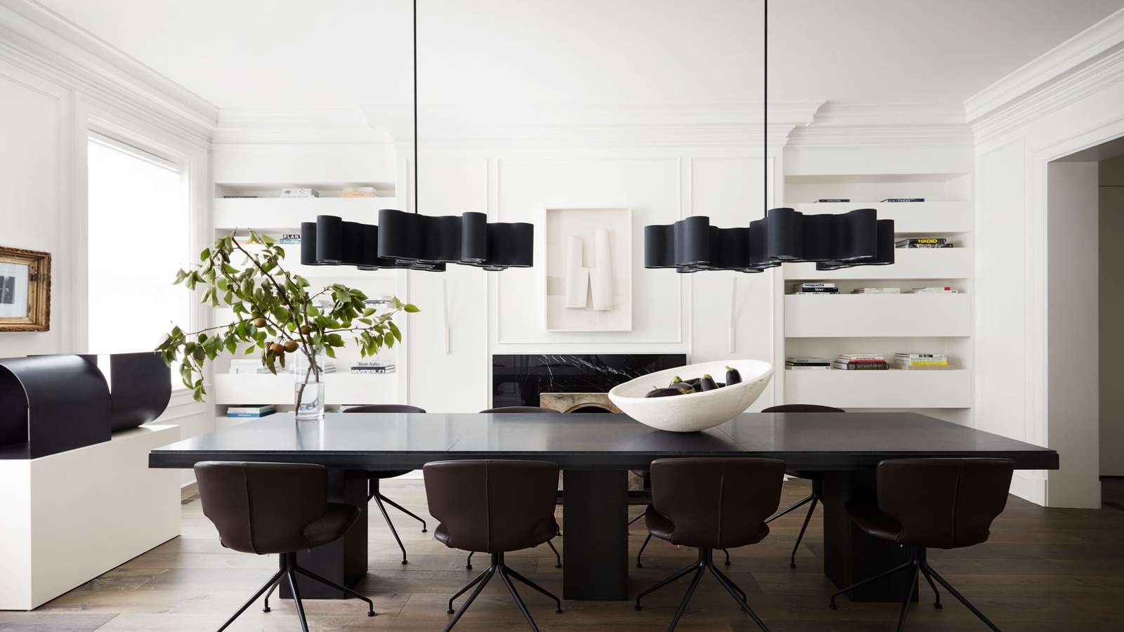 In the dining room, two sculptural light fixtures by Ted Abramczyk Hang above a custom table by Darryl Carter surrounded by Alfredo Häberli chairs upholstered with leather. Sculpture on pedestal (at left) by Christopher Stuart; artwork over fireplace by Manfred Müller.