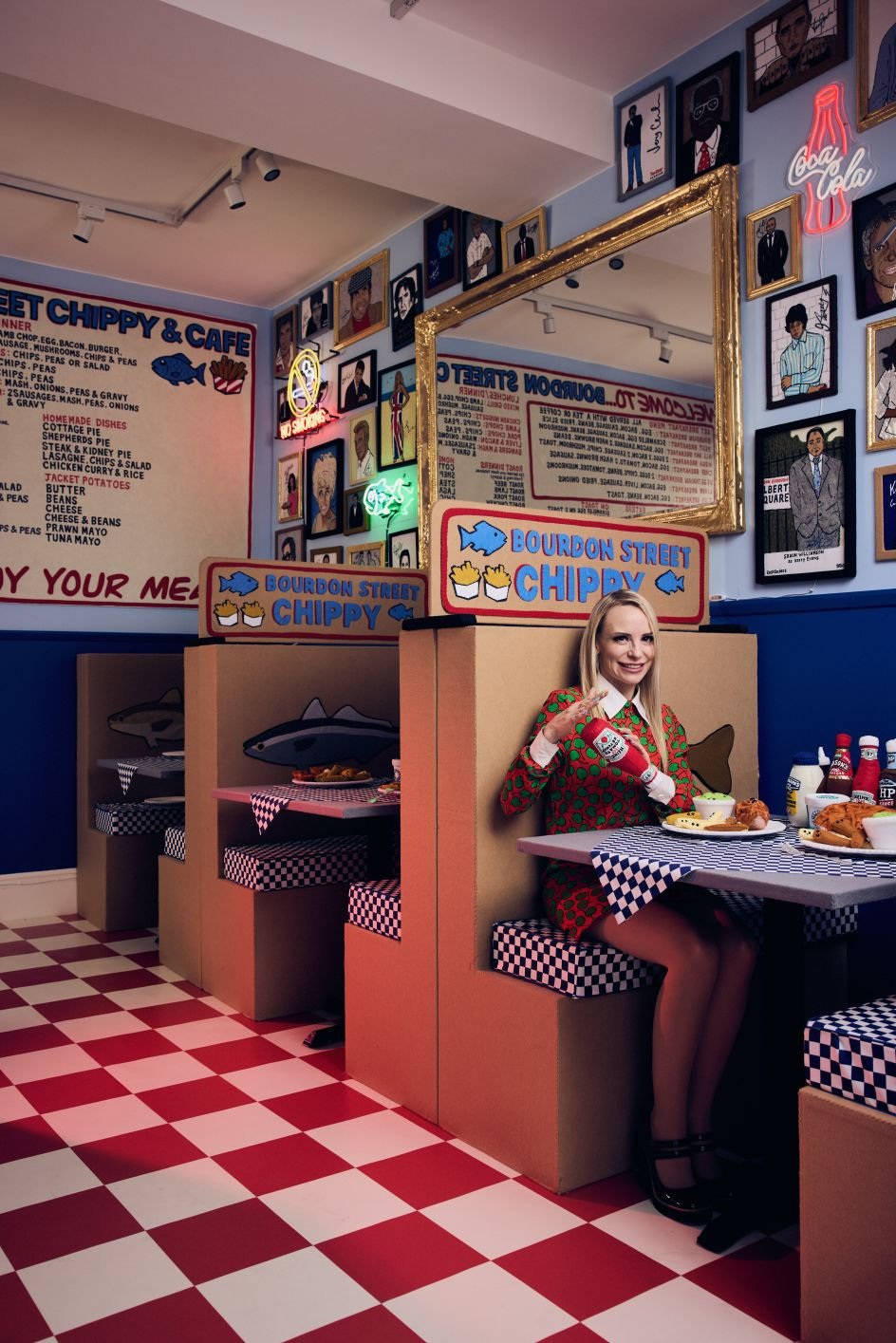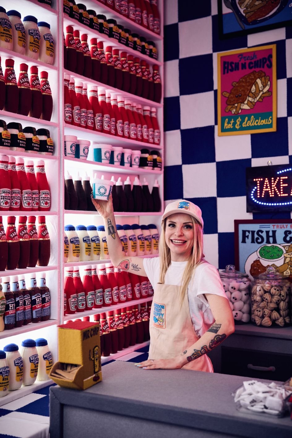 Step inside, and you’ll be met with banquette seating, gleaming signage, and a counter stacked high with everything you’d expect from your local chippy, but recreated in fabric. Over 65,000 hand-stitched pieces fill the space, with 15 different chip shapes in five shades (because why settle for one?). You can “order” your Friday night special and soak up the nostalgic charm of a space that’s as much about British comfort as it is about craft.