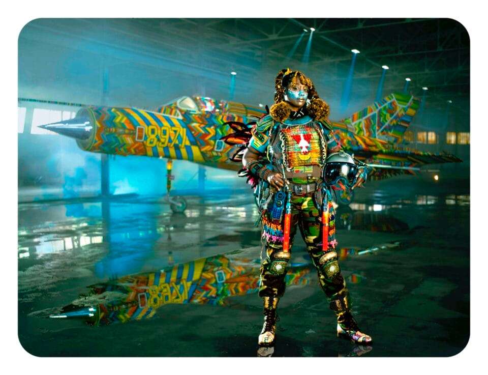 “The MiG-21 Project” combines photography and costume design with historical research and time-honored Indigenous craft. The project encompasses not only the jet but a series of cinematic photographs and elaborate Afrofuturist regalia inspired by military flight suits, African tribal textiles, and space travel.