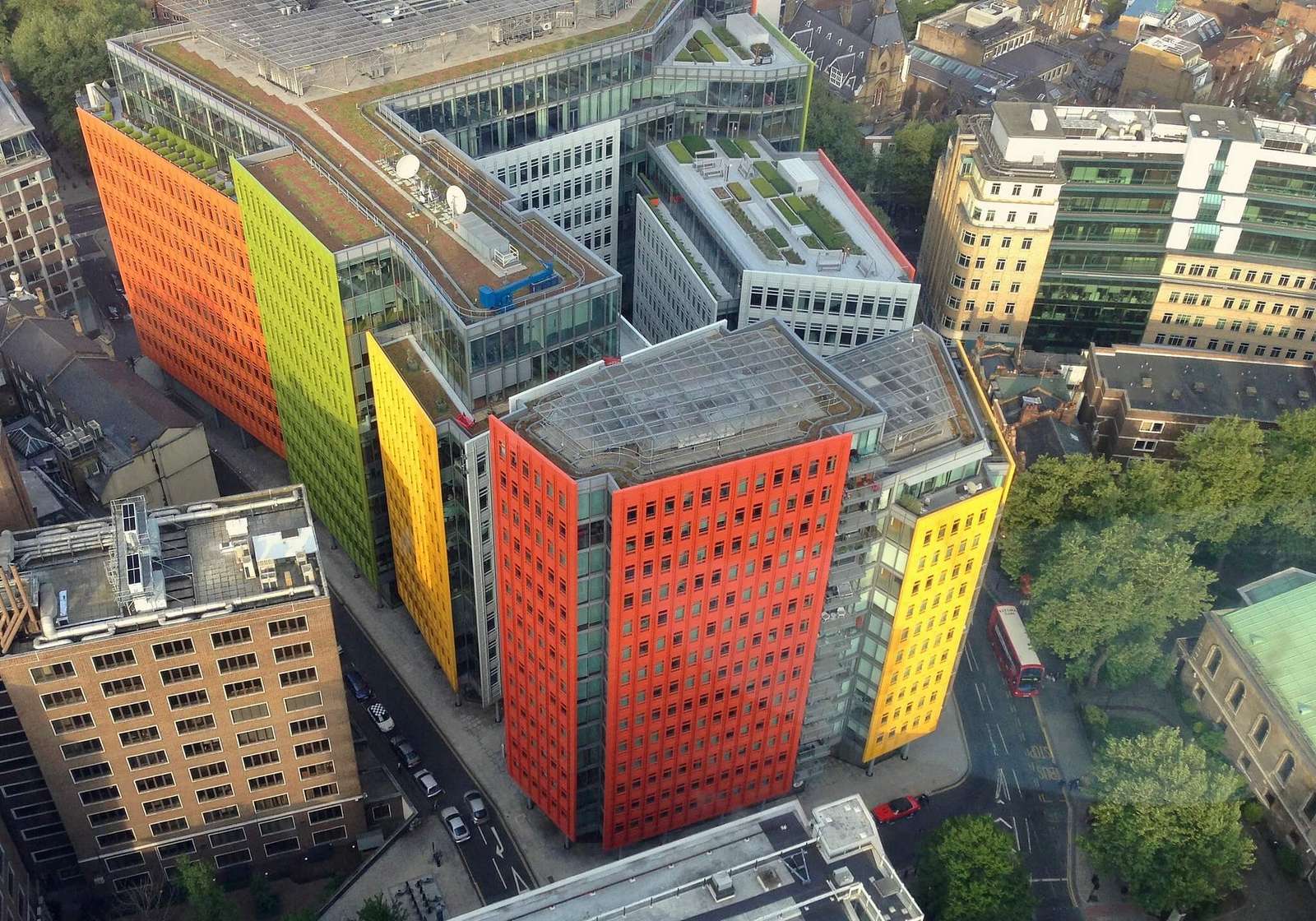 Debuting in London’s West End in May 2010 at a cost of roughly $613 million (£450 million), Central Saint Giles is comprised of two towers—a 15-story residential high-rise and a larger, horseshoe-shaped office block rising 11 stories—that flank a public art-showcasing piazza ringed by ground-level retail and restaurants. The terrace-studded complex’s impossible-to-miss calling card is its riotously-hued facade, which is clad in 134,000 glazed tiles in vibrant shades of red, orange, yellow, and lime green. (Swap out the orange for blue and you’d have the colors of Google’s wordmark logo.)